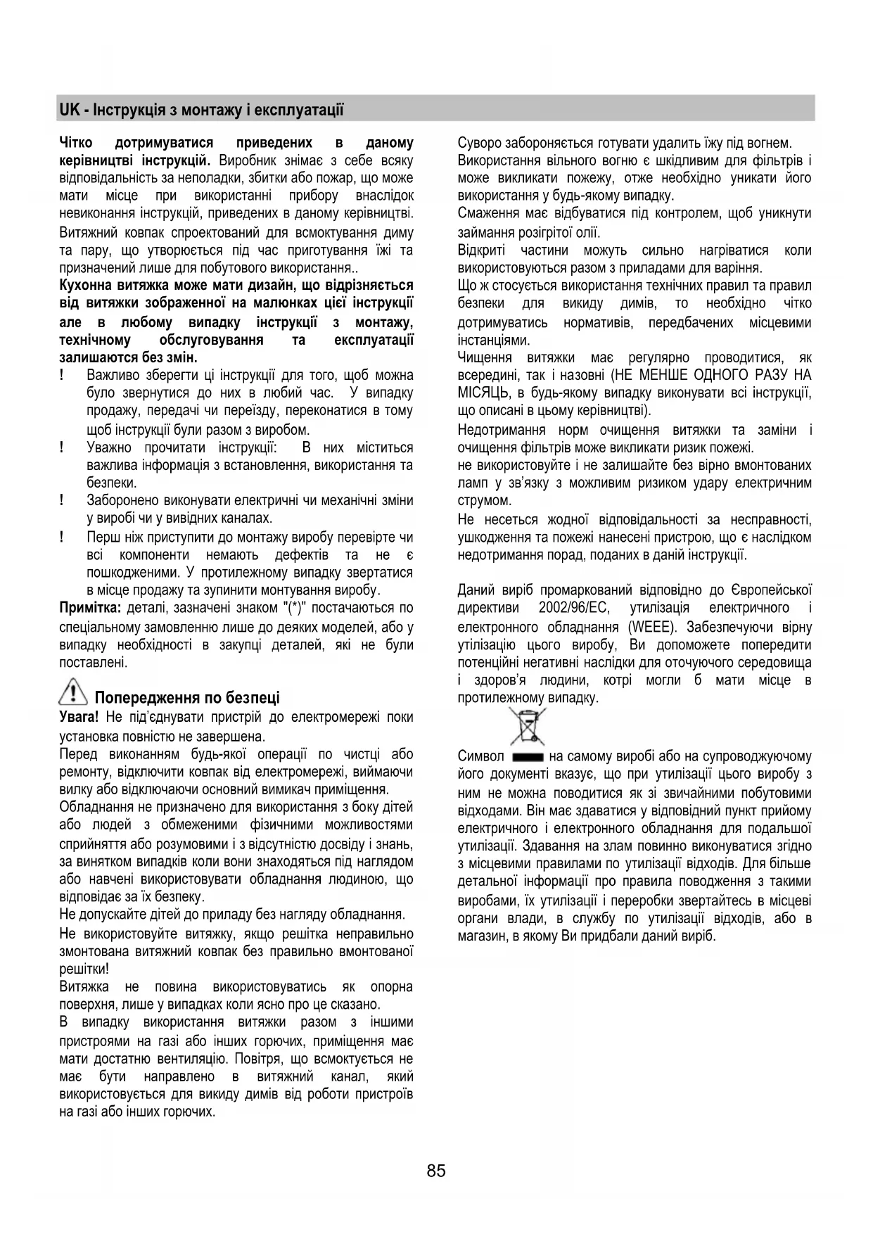 лише у випадках коли ясно про це сказано. В випадку використання витяжки разом з іншими пристроями на газі або інших горючих, приміщення має мати достатню вентиляцію. Повітря, що всмоктується не має бути направлено в витяжний канал, який використовується для викиду димів від роботи пристроїв на газі або інших горючих. Суворо забороняється готувати удалить їжу під вогнем. Використання вільного вогню є шкідливим для фільтрів і може викликати пожежу, отже необхідно уникати його використання у будь-якому випадку. Смаження має відбуватися під контролем, щоб уникнути займання розігрітої олії. Відкриті частини можуть сильно нагріватися коли використовуються разом з приладами для варіння. Що ж стосується використання технічних правил та правил безпеки для викиду димів, то необхідно чітко дотримуватись нормативів, передбачених місцевими інстанціями. Чищення витяжки має регулярно проводитися, як всередині, так і назовні (НЕ МЕНШЕ ОДНОГО РАЗУ НА МІСЯЦЬ, в будь-якому випадку виконувати всі інструкції, що описані в цьому керівництві). Недотримання норм очищення витяжки та заміни