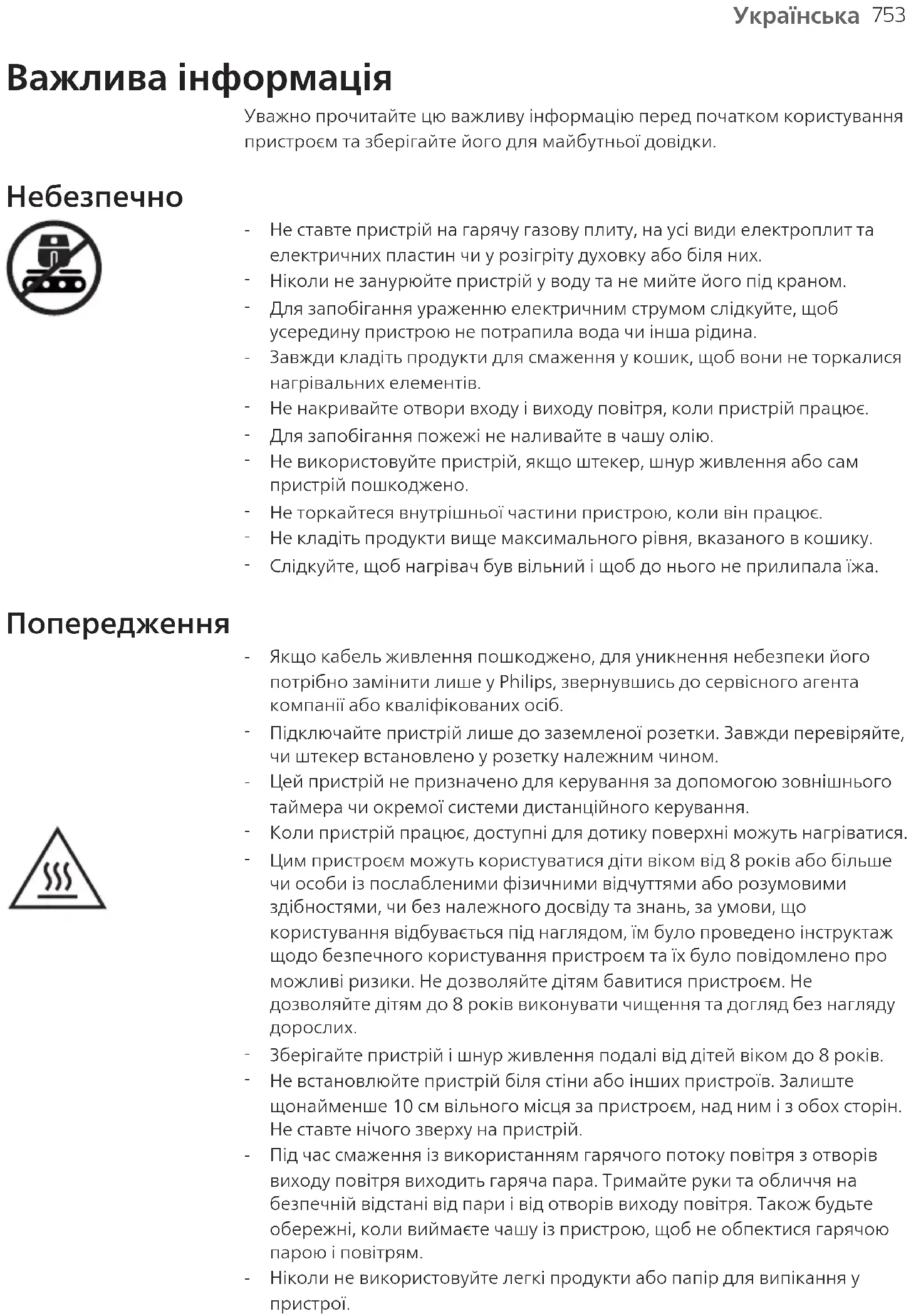 Гарантія та підтримка Versuni пропонує два роки гарантії на цей виріб після дати придбання. Ця гарантія втрачає чинність, якщо несправність виникла внаслідок неправильного використання або обслуговування пристрою. Наша гарантія не впливає на ваші законні права як споживача. Щоб отримати додаткову інформацію або скористатися гарантією, відвідайте наш вебсайт www.philips.com/support. Заява про відповідність Цим повідомленням компанія DAP B.V. стверджує, що мультипіч HD9875 відповідає вимогам Директиви 2014/53/EU. Повний текст заяви про відповідність ЄС доступний за такою адресою в Інтернеті: https://www.philips.com.756