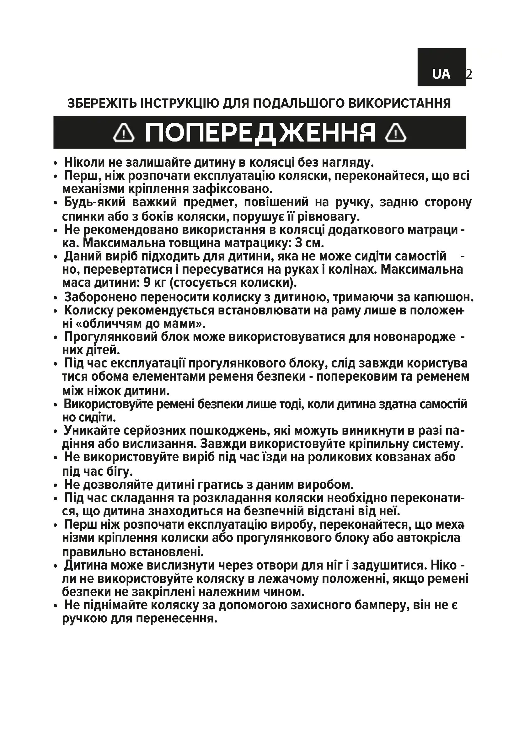 - Ручки для перенесення повинні бути схованими під час викори- стання колиски. ЗАСТЕРЕЖЕННЯ ПЕРШ, НІЖ РОЗПОЧАТИ ЕКСПЛУАТАЦІЮ КОЛЯСКИ, СЛІД УВАЖНО ПРОЧИТАТИ ЦЮ ІНСТРУКЦІЮ З ОБСЛУГОВУВАННЯ.