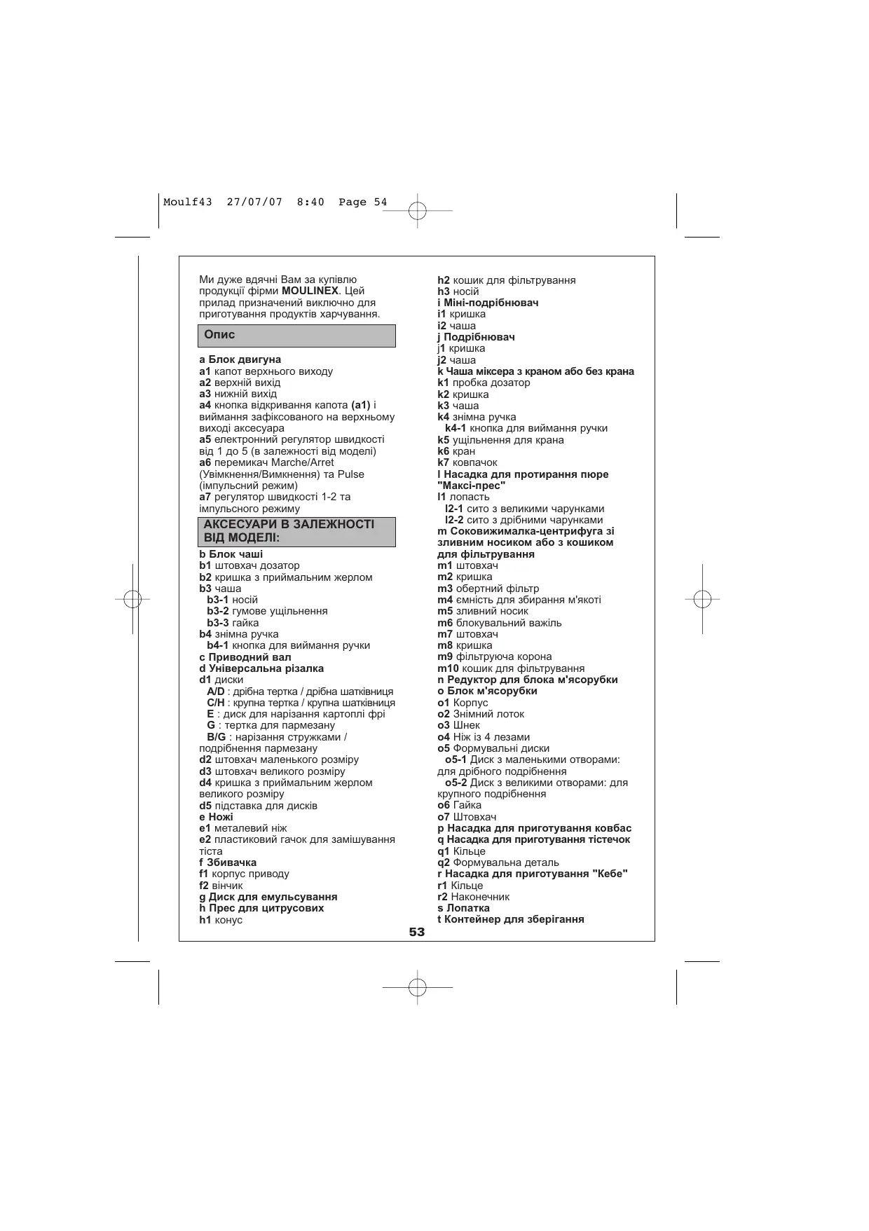 АКСЕСУАРИ У вас є можливість доповнити ваш прилад, придбавши у вашого дистриб'ютора або в одному з уповноважених сервісних центрів фірми Moulinex окремі аксесуари, список яких наведено нижче: Диск із нержавіючої сталі для нарізання картоплі фрі (диск E) Диск із нержавіючої сталі для натирання пармезану (диск G) Диск із нержавіючої сталі для нарізання стружками / подрібнення (диск B/G) Диск із нержавіючої сталі для крупного натирання / крупного нарізання (диск C/H) Диск із нержавіючої сталі для дрібного натирання / дрібного нарізання (диск A/D) Міні-подрібнювач Подрібнювач Чаша міксера Чаша міксера з краном Прозора чаша Металевий ніж Пластиковий гачок для замішування тіста Збивачка Диск для емульсування Прес для цитрусових Насадка "Максі-прес" (тільки для електронної моделі) Соковижималка-центрифуга зі зливним носиком Соковижималка-центрифуга з кошиком для фільтрування Лопатка Блок м'ясорубки: - Редуктор - Ніж - Формувальні диски - Насадка для приготування ковбас - Насадка для приготування тістечок - Насадка для приготування "Кебе"
