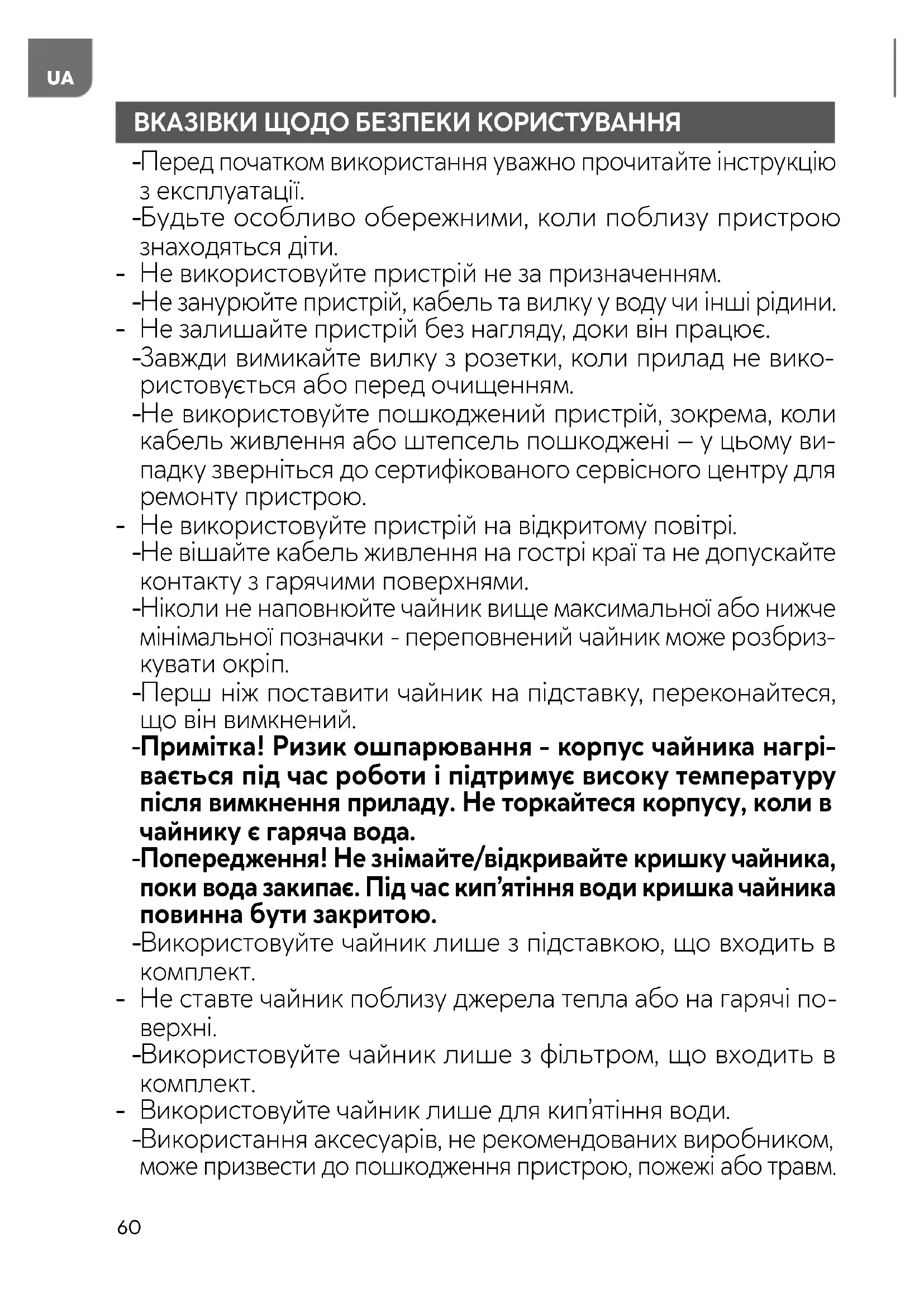 Примітка! Ризик ошпарювання - корпус чайника нагрі- вається під час роботи і підтримує високу температуру після вимкнення приладу. Не торкайтеся корпусу, коли в чайнику є гаряча вода.