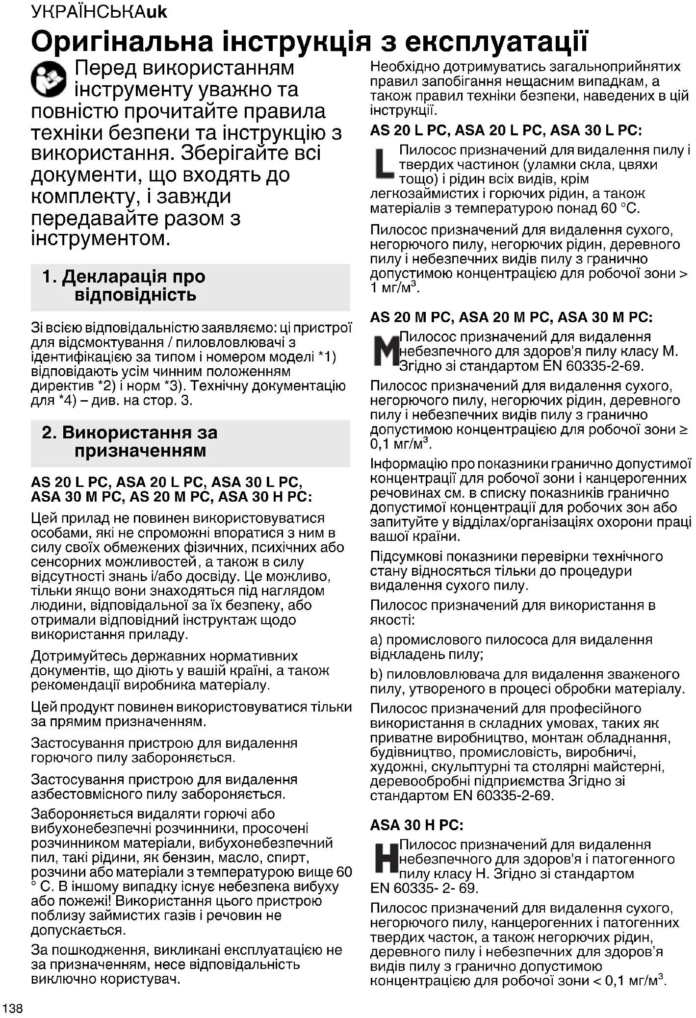 займистих газів і речовин не допускається. За пошкодження, викликані експлуатацією не за призначенням, несе відповідальність виключно користувач. Необхідно дотримуватись загальноприйнятих правил запобігання нещасним випадкам, а також правил техніки безпеки, наведених в цій інструкції. AS 20 L PC, ASA 20 L PC, ASA 30 L PC: Пилосос призначений для видалення пилу і твердих частинок (уламки скла, цвяхи тощо) і рідин всіх видів, крім легкозаймистих і горючих рідин, а також матеріалів з температурою понад 60 °C. Пилосос призначений для видалення сухого, негорючого пилу, негорючих рідин, деревного пилу і небезпечних видів пилу з гранично допустимою концентрацією для робочої зони > 1 мг/м³. AS 20 M PC, ASA 20 M PC, ASA 30 M PC: Пилосос призначений для видалення небезпечного для здоров'я пилу класу M. Згідно зі стандартом EN 60335-2-69. Пилосос призначений для видалення сухого, негорючого пилу, негорючих рідин, деревного пилу і небезпечних видів пилу з гранично допустимою концентрацією для робочої зони ≥ 0,1 мг/м³. Інформацію про показники гранично допустимої концентрації для робочої зони і канцерогенних речовинах см. в списку показників гранично допустимої концентрації для робочих зон або запитуйте у відділах/організаціях охорони