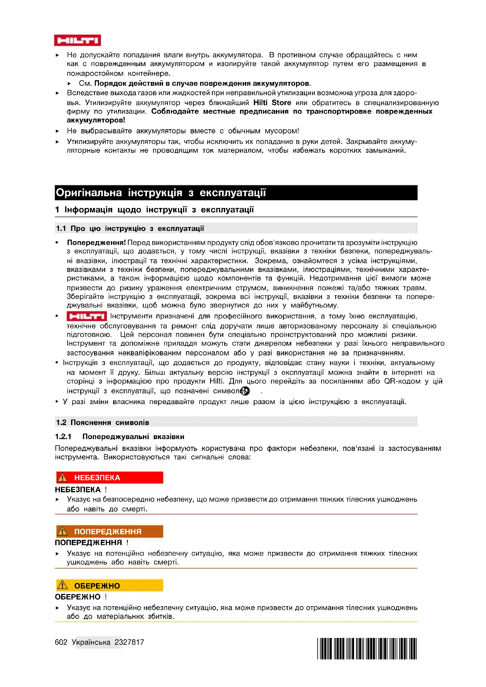▶ Дотримуйтеся наведених нижче вказівок з техніки безпеки, щоб гарантувати безпечне транс- портування та використання літій-іонних акумуляторних батарей. Невиконання цих вказівок може призвести до подразнення шкіри, серйозних травм внаслідок контакту з корозійними речо- винами, а також до хімічних опіків, пожежі та/або вибуху. ▶ Користуйтеся лише повністю справними акумуляторними батареями. ▶ Обережно поводьтеся з акумуляторними батареями, щоб уникнути їхнього пошкодження або витоку рідин, які є дуже небезпечними для здоров'я! ▶ Забороняється вносити зміни до конструкції акумуляторних батарей або модифікувати їх! ▶ Акумуляторні батареї забороняється розбирати, роздавлювати, нагрівати до температури понад 80 °C (176 °F) або спалювати. ▶ Не використовуйте та не заряджайте акумуляторні батареї, які зазнали впливу ударного наванта- ження або були пошкоджені іншим чином. Регулярно перевіряйте акумуляторні батареї на наявність пошкоджень.608 Українська 2327817 *2327817* ▶ Ніколи не використовуйте акумуляторні батареї із вторинних матеріалів або відремонтовані акуму- ляторні батареї. ▶ Не застосовуйте акумуляторну батарею або акумуляторний електроінструмент у якості ударного інструмента. ▶ Ніколи не піддавайте акумуляторні батареї впливу прямих сонячних променів, високих температур, іскор або відкритого вогню. Невиконання цієї вимоги може призвести до вибуху. ▶ Не торкайтеся полюсів елементів живлення пальцями, робочими інструментами, прикрасами, а також іншими предметами зі струмопровідних матеріалів. Невиконання цієї вимоги може привести до пошкодження акумуляторної батареї, матеріальних збитків і травм. ▶ Захищайте акумуляторні батареї від впливу дощу, вологи та рідин. Якщо всередину акумуляторної батареї потрапить волога, це може спричинити коротке замикання, ураження електричним струмом, опіки, пожежу або вибух. ▶ Використовуйте акумуляторну батарею тільки з тими електроінструментами та зарядними пристро- ями, для яких вона призначена. При цьому також дотримуйтеся вказівок, наведених в інструкціях з експлуатації відповідних виробів. ▶ Не використовуйте та не зберігайте акумуляторні батареї у вибухонебезпечному середовищі. ▶ Якщо акумуляторна батарея гаряча на дотик, вона може бути пошкоджена. Залиште акумуляторну батарею у захищеному від вогню місці на достатній відстані від горючих матеріалів, де за нею можна спостерігати. Зачекайте, доки акумуляторна батарея не охолоне. Якщо через годину акумуляторна батарея все ще залишається гарячою на дотик, це свідчить про її несправність. Зверніться до сервісної служби компанії Hilti або ознайомтеся з указівками щодо техніки безпеки та належної експлуатації літій-іонних акумуляторних батарей Hilti. Дотримуйтеся спеціальних указівок щодо транспортування, зберігання та використання літій- іонних акумуляторних батарей. 625 Ознайомтеся з указівками щодо техніки безпеки та належної експлуатації літій-іонних акуму- ляторних батарей Hilti: для цього відскануйте QR-код, наведений наприкінці цієї інструкції з експлуатації.