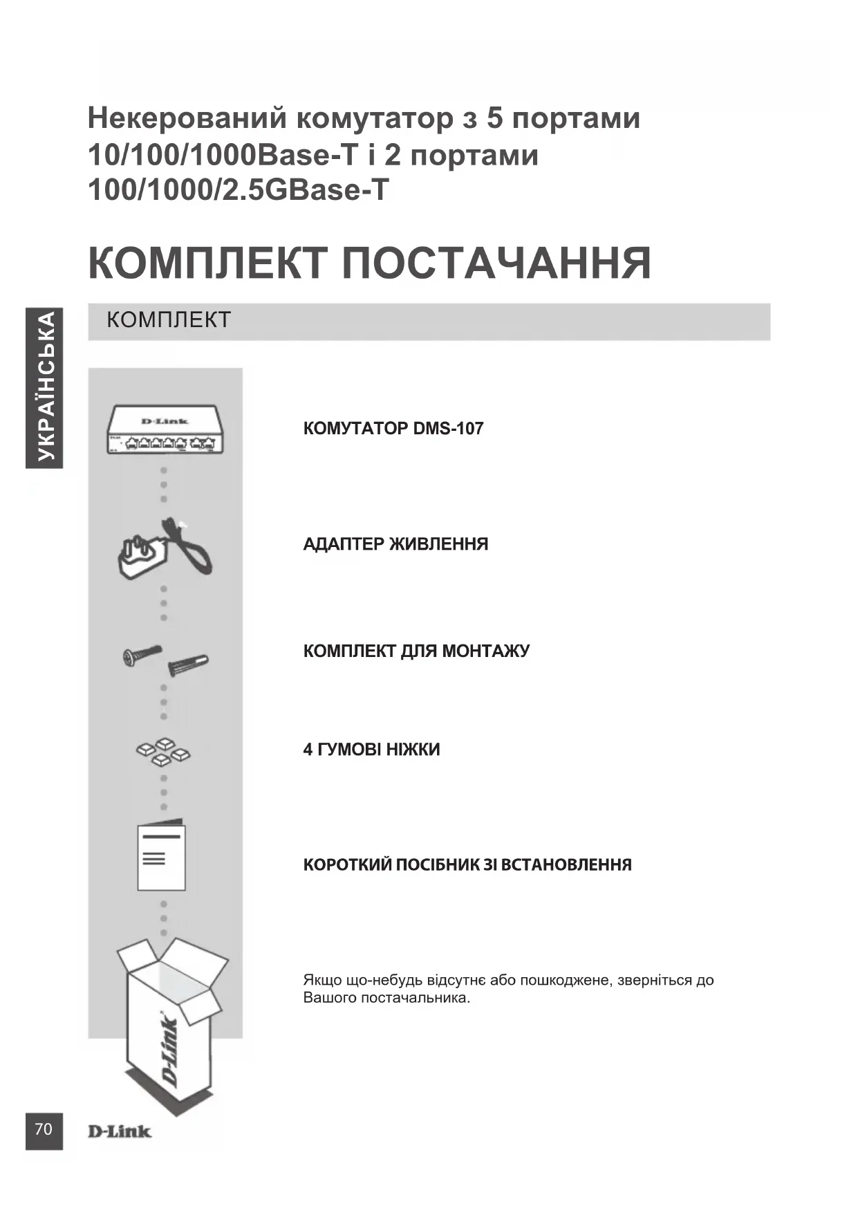 КОРОТКИЙ ПОСІБНИК ЗІ ВСТАНОВЛЕННЯ Некерований комутатор з 5 портами 10/100/1000Base-T і 2 портами 100/1000/2.5GBase-T КОМПЛЕКТ ДЛЯ МОНТАЖУ 4 ГУМОВI НIЖКИ71