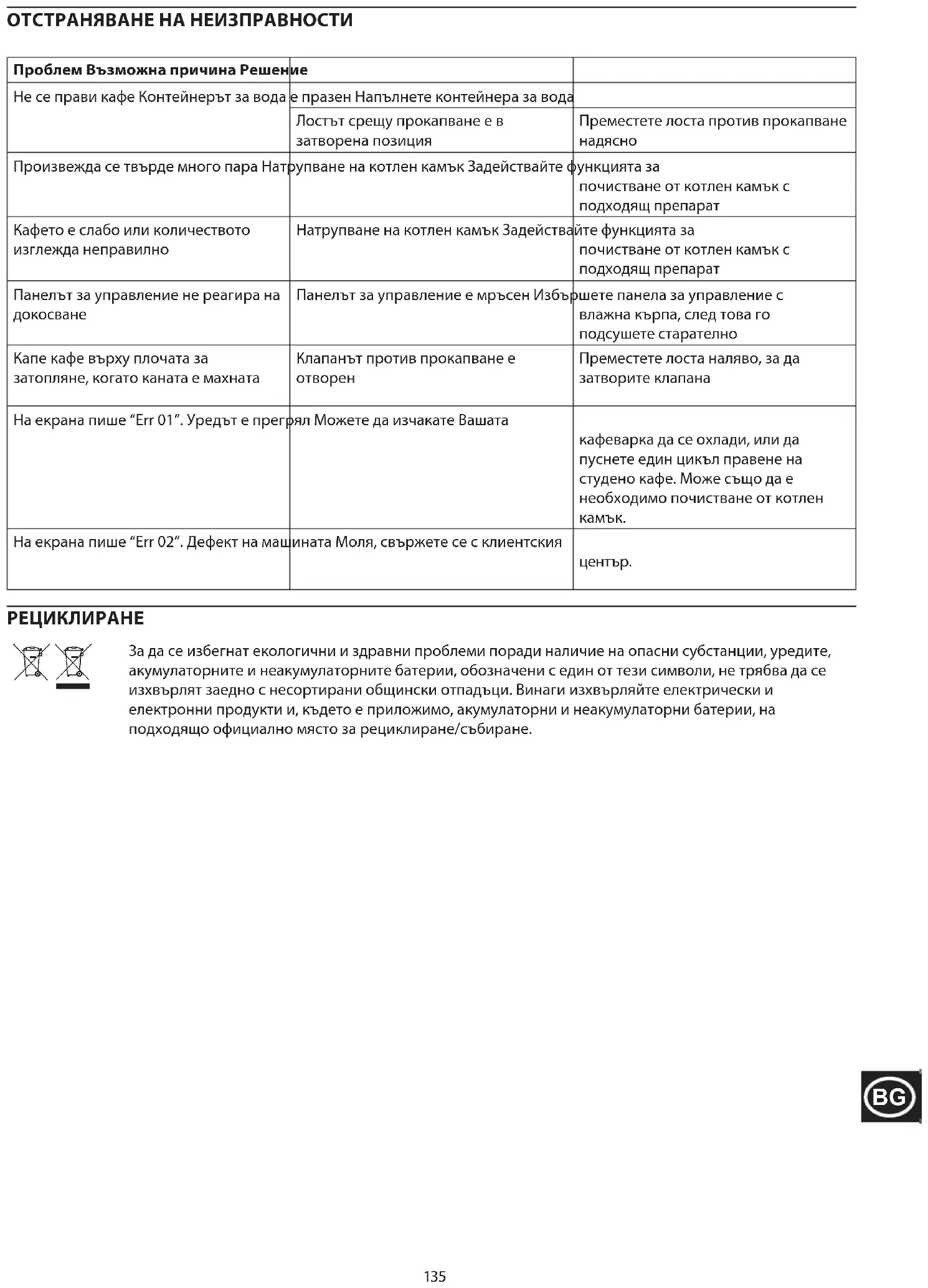 Перемістіть важіль ліворуч, щоб перекрити клапан На дисплеї відображається повідомлення «Err 01» Перегрівання пристрою Або зачекайте, доки кавоварка охолоне, або запустіть цикл холодного заварювання. До того ж може знадобитися видалення накипу На дисплеї відображається повідомлення «Err 02» Несправність кавоварки Зверніться до служби підтримки