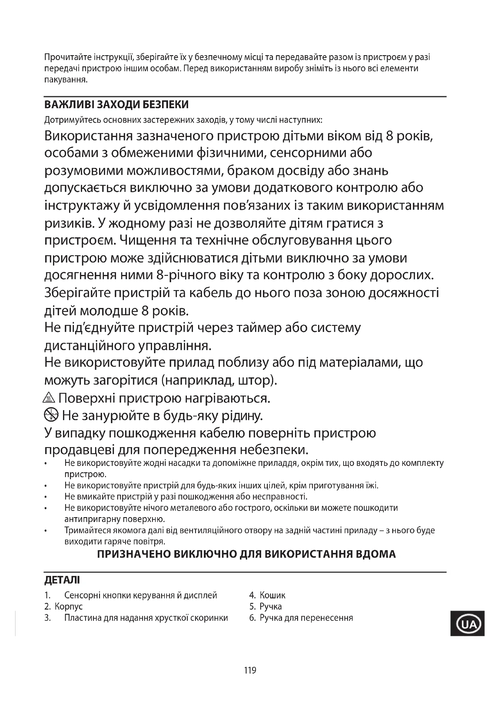 ВАЖЛИВІ ЗАХОДИ БЕЗПЕКИ Дотримуйтесь основних застережних заходів, у тому числі наступних: Використання зазначеного пристрою дітьми віком від 8 років, особами з обмеженими фізичними, сенсорними або розумовими можливостями, браком досвіду або знань допускається виключно за умови додаткового контролю або інструктажу й усвідомлення пов’язаних із таким використанням ризиків. У жодному разі не дозволяйте дітям гратися з пристроєм. Чищення та технічне обслуговування цього пристрою може здійснюватися дітьми виключно за умови досягнення ними 8-річного віку та контролю з боку дорослих. Зберігайте пристрій та кабель до нього поза зоною досяжності дітей молодше 8 років. Не під’єднуйте пристрій через таймер або систему дистанційного управління. Не використовуйте прилад поблизу або під матеріалами, що можуть загорітися (наприклад, штор). h Поверхні пристрою нагріваються. i Не занурюйте в будь-яку рідину. У випадку пошкодження кабелю поверніть пристрою продавцеві для попередження небезпеки.