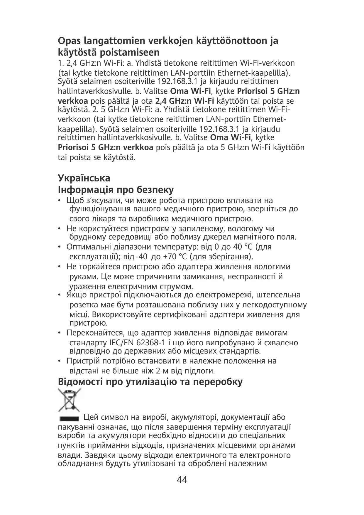 - Пристрій потрібно встановити в належне положення на відстані не більше ніж 2 м від підлоги. Відомості про утилізацію та переробку Цей символ на виробі, акумуляторі, документації або пакуванні означає, що після завершення терміну експлуатації вироби та акумулятори необхідно відносити до спеціальних пунктів приймання відходів, призначених місцевими органами влади. Завдяки цьому відходи електричного та електронного обладнання будуть утилізовані та оброблені належним 44способом, який дає можливість зберегти цінні матеріали й захистити здоров’я людей і навколишнє середовище. Щоб дізнатися більше, зверніться до місцевих органів влади, роздрібного продавця чи служби утилізації побутових відходів або відвідайте вебсайт https://consumer.huawei.com/en/. Інформація про радіочастотне випромінювання Згідно з міжнародними вимогами конструкція пристрою відповідає обмеженням, установленим на ринку, де він пропонується. Пристрій слід установити й експлуатувати так, щоб відстань між ним і вашим тілом становила не менше ніж 20 см. Відповідність нормативним актам ЄС Цим компанія Huawei Device Co., Ltd. заявляє, що пристрій WS7001 V2 відповідає вимогам таких Директив: RED 2014/53/EU, RoHS 2011/65/EU, ErP 2009/125/EC. З повним текстом декларації про відповідність нормативним вимогам ЄС, докладною інформацією про продукти, що споживають енергію, а також найновішою інформацією про аксесуари та програмне забезпечення можна ознайомитися на сторінці https://consumer.huawei.com/certication