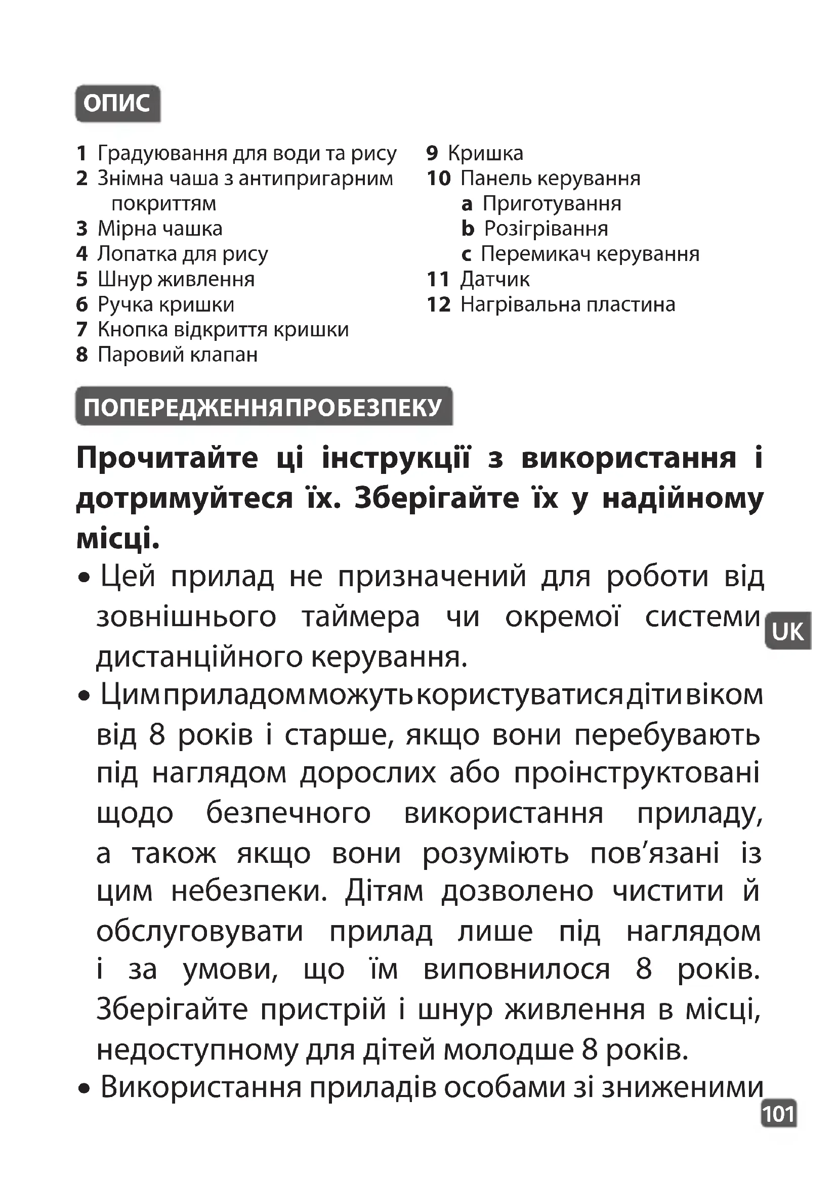 3 Мірна чашка 4 Лопатка для рису 5 Шнур живлення 6 Ручка кришки 7 Кнопка відкриття кришки 8 Паровий клапан 9 Кришка 10 Панель керування a Приготування b Розігрівання c Перемикач керування 11 Датчик 12 Нагрівальна пластина103102