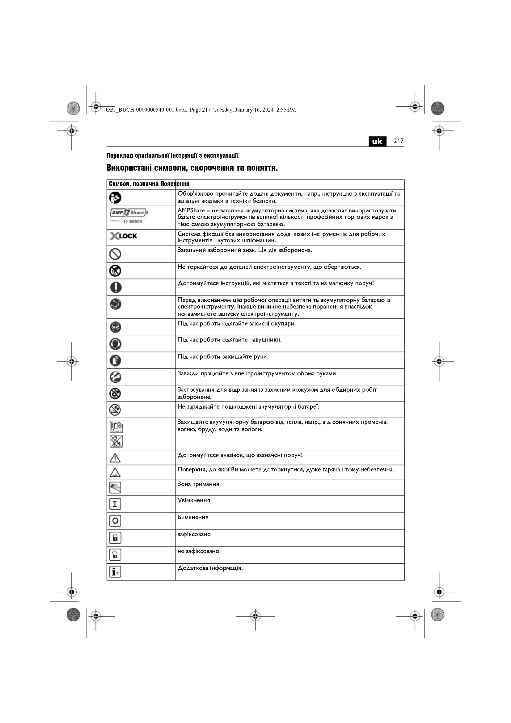 Переклад оригінальної інструкції з експлуатації. Використані символи, скорочення та поняття. Символ, позначка Пояснення Обов’язково прочитайте додані документи, напр., інструкцію з експлуатації та загальні вказівки з техніки безпеки. AMPShare – це загальна акумуляторна система, яка дозволяє використовувати багато електроінструментів великої кількості професійних торгових марок з тією самою акумуляторною батареєю. Система фіксації без використання додаткових інструментів для робочих інструментів і кутових шліфмашин. Загальний заборонний знак. Ця дія заборонена. Не торкайтеся до деталей електроінструменту, що обертаються. Дотримуйтеся інструкцій, які мі стяться в тексті та на малюнку поруч! Перед виконанням цієї робочої операції витягніть акумуляторну батарею із електроінструменту. Інакше виникне небезпека поранення внаслідок ненавмисного запуску електроінструменту. Під час роботи одягайте захисні окуляри. Під час роботи одягайте навушники. Під час роботи захищайте руки. Завжди працюйте з електроінструментом обома руками. Застосування для відрізання із захисним кожухом для обдирних робіт заборонене. Не заряджайте пошкоджені акумуляторні батареї. Захищайте акумуляторну батарею від тепла, напр., від сонячних променів, вогню, бруду, води та вологи. Дотримуйтеся вказівок, що зазначені поруч!