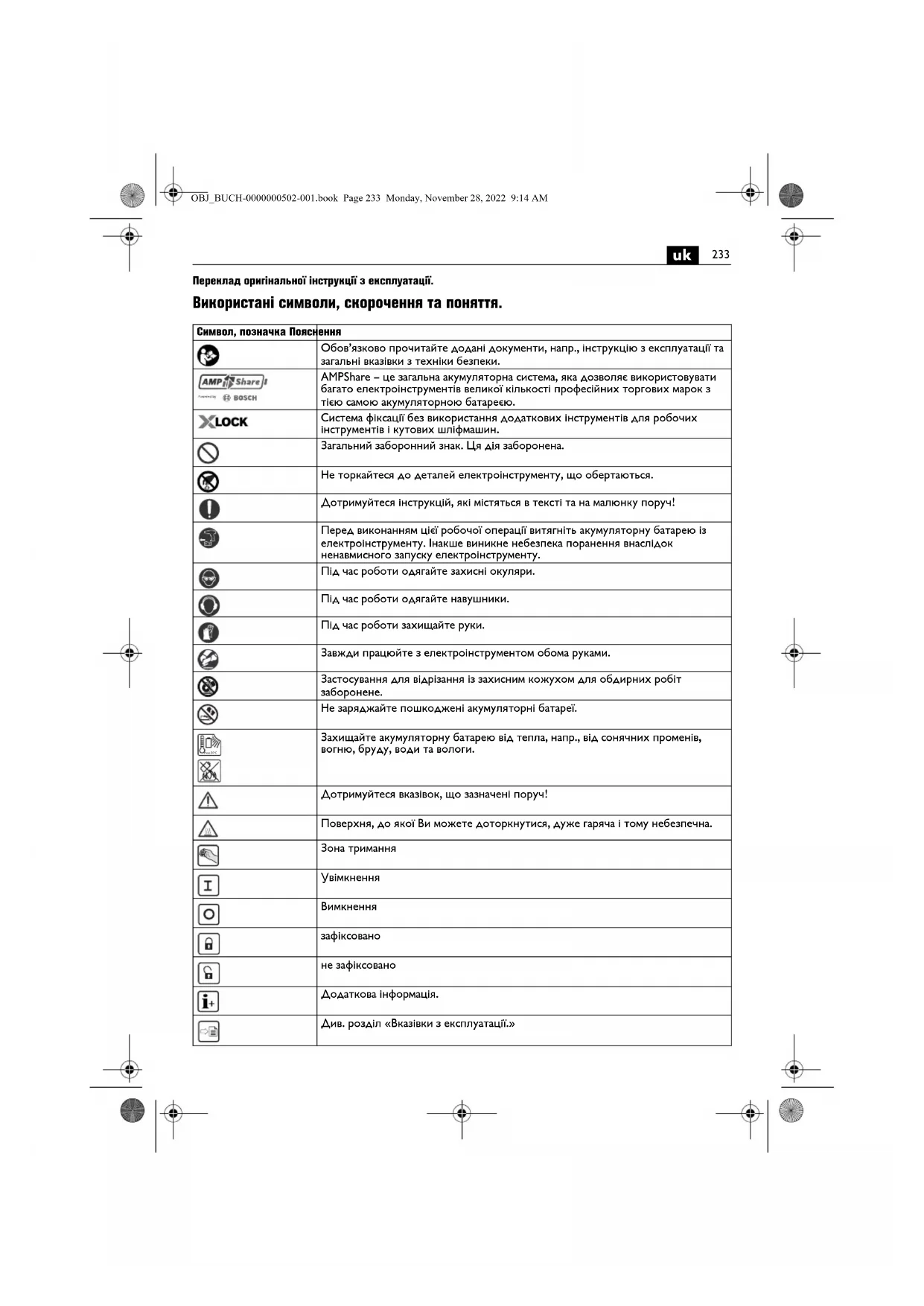 Переклад оригінальної інструкції з експлуатації. Використані символи, скорочення та поняття. Символ, позначка Пояснення Обов’язково прочитайте додані документи, напр., інструкцію з експлуатації та загальні вказівки з техніки безпеки. AMPShare – це загальна акумуляторна система, яка дозволяє використовувати багато електроінструментів великої кількості професійних торгових марок з тією самою акумуляторною батареєю. Система фіксації без використання додаткових інструментів для робочих інструментів і кутових шліфмашин. Загальний заборонний знак. Ця дія заборонена. Не торкайтеся до деталей електроінструменту, що обертаються. Дотримуйтеся інструкцій, які містяться в тексті та на малюнку поруч! Перед виконанням цієї робочої операції витягніть акумуляторну батарею із електроінструменту. Інакше виникне небезпека поранення внаслідок ненавмисного запуску електроінструменту. Під час роботи одягайте захисні окуляри. Під час роботи одягайте навушники. Під час роботи захищайте руки. Завжди працюйте з електроінструментом обома руками. Застосування для відрізання із захисним кожухом для обдирних робіт заборонене. Не заряджайте пошкоджені акумуляторні батареї. Захищайте акумуляторну батарею від тепла, напр., від сонячних променів, вогню, бруду, води та вологи. Дотримуйтеся вказівок, що зазначені поруч! Поверхня, до якої Ви можете доторкнутися, дуже гаряча і тому небезпечна. Зона тримання