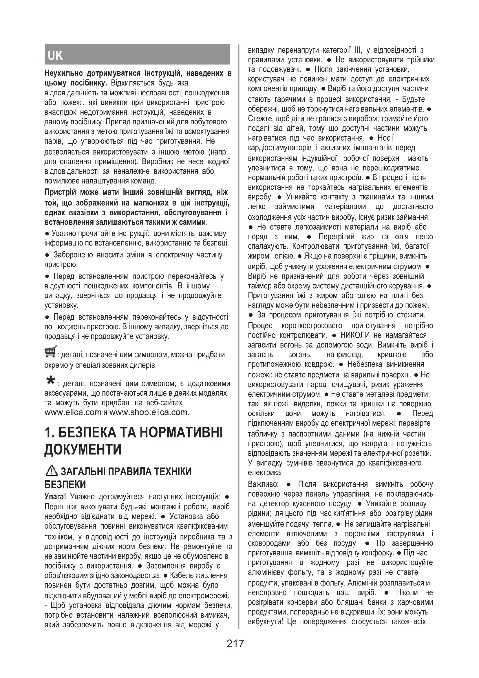 Если после вышеупомянутых проверок проблема не устранена, обратитесь в ближайший сервисный центр. 216UK Неухильно дотримуватися інструкцій, наведених в цьому посібнику. Відхиляється будь яка відповідальність за можливі несправності, пошкодження або пожежі, які виникли при використанні пристрою внаслідок недотримання інструкцій, наведених в даному посібнику. Прилад призначений для побутового використання з метою приготування їжі та всмоктування парів, що утворюються під час приготування. Не дозволяється використовувати з іншою метою (напр. для опалення приміщення). Виробник не несе жодної відповідальності за неналежне використання або помилкове налаштування команд. Пристрій може мати інший зовнішній вигляд, ніж той, що зображений на малюнках в цій інструкції, однак вказівки з використання, обслуговування і встановлення залишаються такими ж самими. ● Уважно прочитайте інструкції: вони містять важливу інформацію по встановленню, використанню та безпеці. ● Заборонено вносити зміни в електричну частину