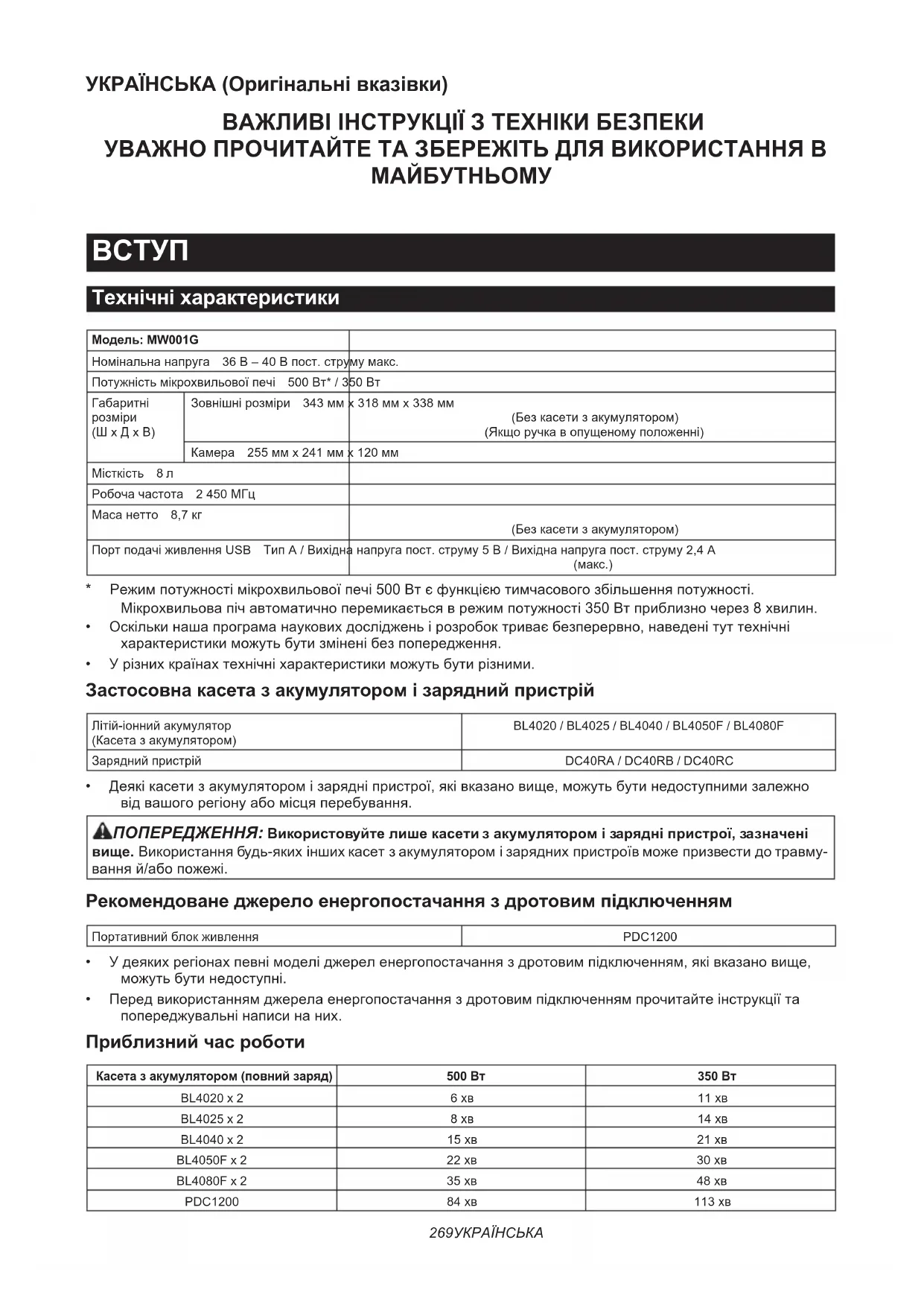 Технічні характеристики Модель: MW001GНомінальнанапруга 36В–40Впост.струмумакс.Потужністьмікрохвильовоїпечі 500Вт*/350ВтГабаритнірозміри(ШxДxВ)Зовнішнірозміри 343ммx318ммx338мм(Безкасетизакумулятором)(Якщоручкавопущеномуположенні)Камера 255ммx241ммx120ммМісткість 8лРобочачастота 2450МГцМасанетто 8,7кг(Безкасетизакумулятором)ПортподачіживленняUSB ТипA/Вихіднанапругапост.струму5В/Вихіднанапругапост.струму2,4A(макс.)* Режимпотужностімікрохвильовоїпечі500Втєфункцієютимчасовогозбільшенняпотужності.Мікрохвильовапічавтоматичноперемикаєтьсяврежимпотужності350Втприблизночерез8хвилин.• Оскількинашапрограманауковихдослідженьірозробоктриваєбезперервно,наведенітуттехнічніхарактеристикиможутьбутизміненібезпопередження.• Урізнихкраїнахтехнічніхарактеристикиможутьбутирізними. Застосовна касета з акумулятором і зарядний пристрій Літій-іоннийакумулятор(Касетазакумулятором)BL4020 / BL4025 / BL4040 / BL4050F / BL4080FЗаряднийпристрій DC40RA / DC40RB / DC40RC• Деякікасетизакумуляторомізарядніпристрої,яківказановище,можутьбутинедоступнимизалежновідвашогорегіонуабомісцяперебування. ПОПЕРЕДЖЕННЯ: Використовуйте лише касети з акумулятором і зарядні пристрої, зазначені вище.Використаннябудь-якихіншихкасетзакумуляторомізаряднихпристроївможепризвестидотравму- ванняй/абопожежі. Рекомендоване джерело енергопостачання з дротовим підключенням Портативнийблокживлення PDC1200• Удеякихрегіонахпевнімоделіджереленергопостачанняздротовимпідключенням,яківказановище,можутьбутинедоступні.• Передвикористаннямджерелаенергопостачанняздротовимпідключеннямпрочитайтеінструкціїтапопереджувальнінаписинаних. Приблизний час роботи Касета з акумулятором (повний заряд) 500 Вт 350 ВтBL4020 x 2 6хв 11хвBL4025 x 2 8хв 14хвBL4040 x 2 15хв 21хвBL4050F x 2 22хв 30хвBL4080F x 2 35хв 48хвPDC1200 84хв 113хв270 УКРАЇНСЬКА ПРИМІТКА:Значенняєприблизнимийможутьвідрізнятисязалежновідрівнязарядуйумоввикористання. ПРИМІТКА:Зоднимакумуляторомприблизнийчасроботискладаєприблизновдвоєменше,ніжздвома акумуляторами. Призначення Цейприладпризначенийдляпідігріванняхарчових