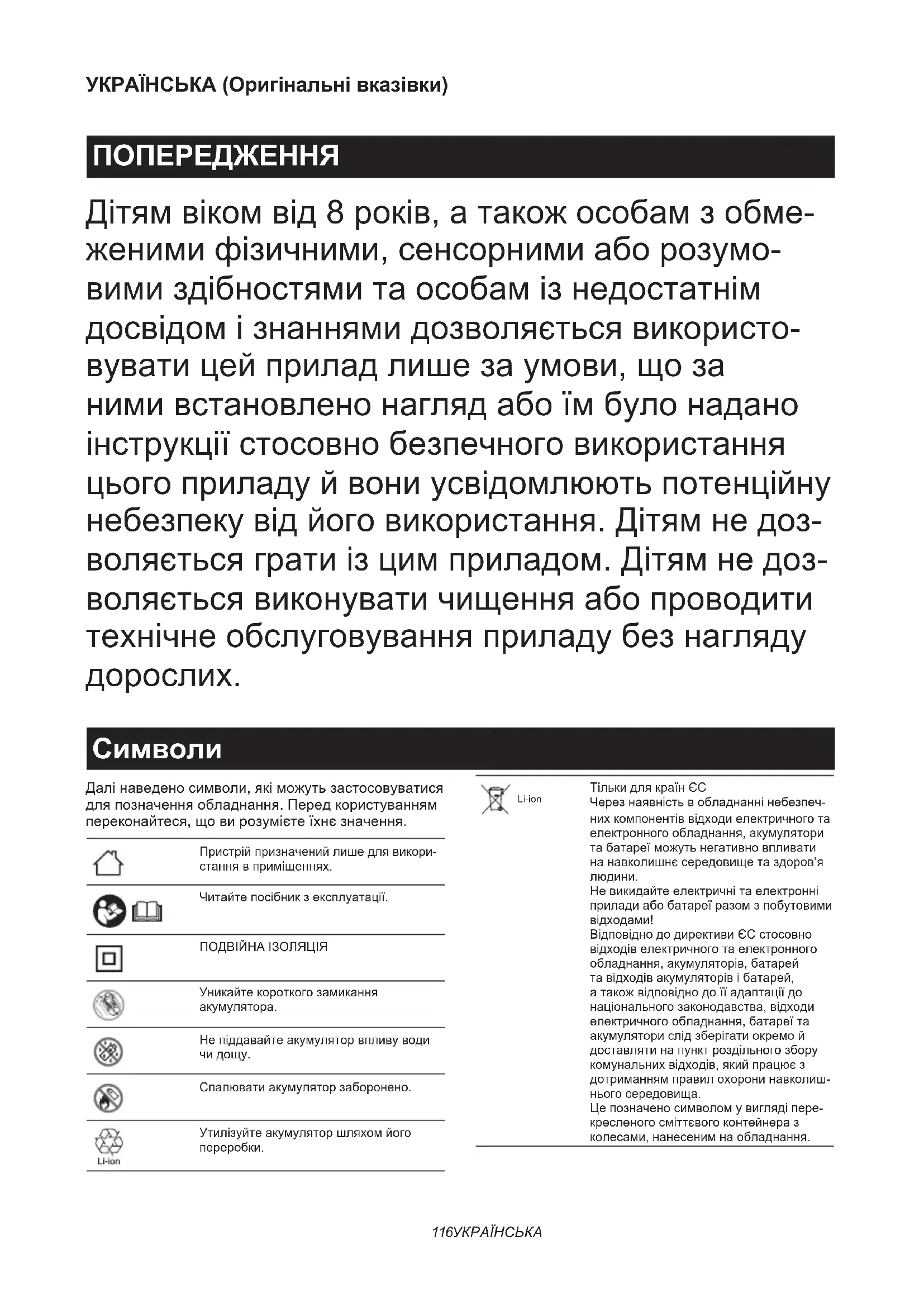Li-ion Тільки для країн ЄС Через наявність в обладнанні небезпеч- них компонентів відходи електричного та електронного обладнання, акумулятори та батареї можуть негативно впливати на навколишнє середовище та здоров’я