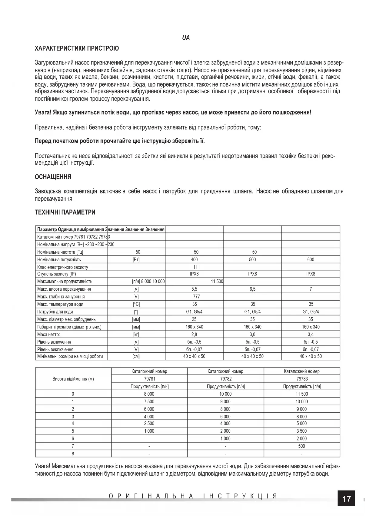 Заводська комплектація включає в себе насос і патрубок для приєднання шланга. Насос не обладнано шлангом для перекачування. ТЕХНІЧНІ ПАРАМЕТРИ Параметр Одиниця вимірювання Значення Значення Значення Каталожний номер 79781 79782 79783 Номінальна напруга [В~] ~230 ~230 ~230 Номінальна частота [Гц] 50 50 50 Номінальна потужність [Вт] 400 500 600 Клас електричного захисту I I I Ступень захисту (IP) IPX8 IPX8 IPX8 Максимальна продуктивність [л/н] 8 000 10 000 11 500 Макс. висота перекачування [м] 5,5 6,5 7 Макс. глибина занурення [м] 777 Макс. температура води [