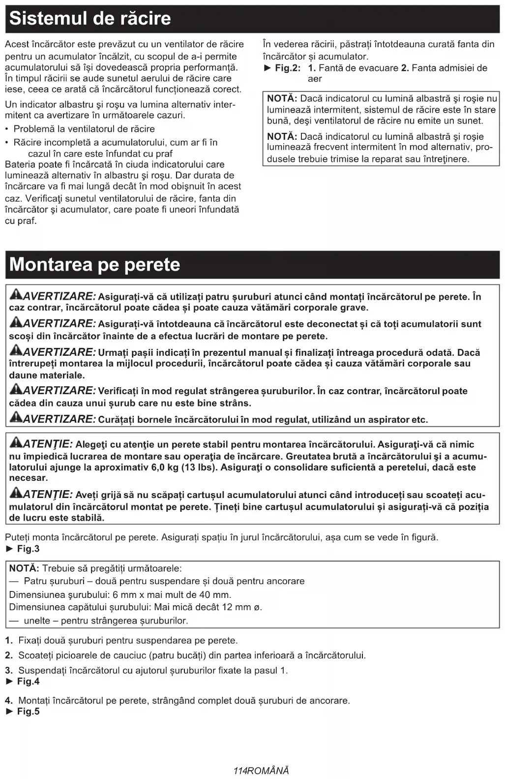 ПРИМІТКА: Якщо звуку охолоджувального вен- тилятора не чутно, але сигнальний індикатор не блимає синім і червоним кольором, система охо- лодження працює належним чином. ПРИМІТКА: Якщо індикатор швидко блимає поперемінно синім і червоним кольором, вироби слід відправити на ремонт або технічне обслуговування.Кріплення до стіни ПОПЕРЕДЖЕННЯ: Під час монтажу зарядного пристрою на стіну обов’язково прикріпіть його чотирма гвинтами. В іншому випадку зарядний пристрій може впасти й завдати травм. ПОПЕРЕДЖЕННЯ: Перед початком робіт із кріплення до стіни переконайтеся в тому, що заряд- ний пристрій відключено від мережі, а всі акумулятори вийнято із зарядного пристрою. ПОПЕРЕДЖЕННЯ: Виконуйте наведені в цьому посібнику інструкції та завершуйте всі проце- дури відразу. Зарядний пристрій може впасти й спричинити травму або пошкодження, якщо роботи будуть виконані не в повному обсязі. ПОПЕРЕДЖЕННЯ: Регулярно перевіряйте надійність затягування гвинтів. В іншому випадку зарядний пристрій може впасти через ослаблення гвинта. ПОПЕРЕДЖЕННЯ: Регулярно очищайте клеми на зарядному пристрої за допомогою пиловлов- лювача тощо. ОБЕРЕЖНО: Для монтажу зарядного пристрою вибирайте стійку стіну. Переконайтеся в тому, що для монтажних робіт або заряджання немає ніяких перешкод. Загальна маса зарядного пристрою й акумулятора становить приблизно 6,0 кг (13 фунт.). За необхідності зміцніть стіну належним чином. ОБЕРЕЖНО: Будьте обережні, щоб не впустити касету з акумулятором під час установки або виймання акумулятора з настінного зарядного пристрою. Міцно тримайте касету з акумулятором і зберігайте стійке положення. Ви можете встановити зарядний пристрій на стіну. Навколо зарядного пристрою слід залишити необхідну відстань, як показано на рисунку. ► Рис.3 ПРИМІТКА: Деталі, які необхідно підготувати. — Чотири гвинти – два для підвішування й два для фіксації Розміри гвинта: діаметр 6 мм, довжина щонайменше 40 мм. Розмір головки гвинта: менше ø12 мм. — Інструменти – для затягування гвинтів