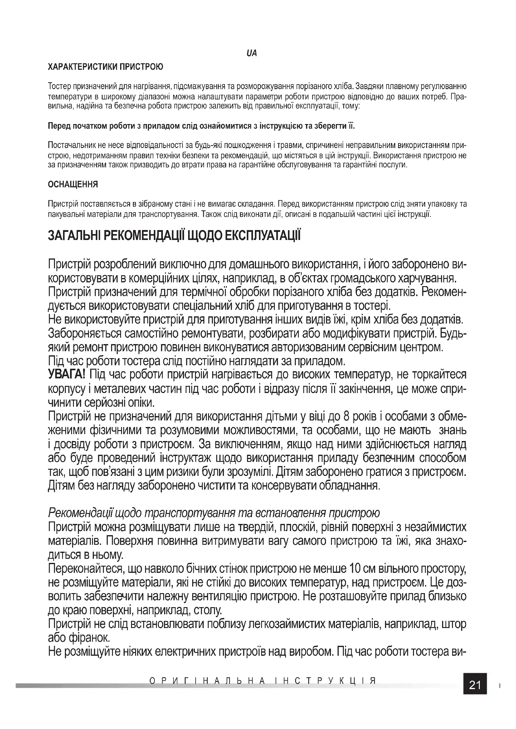 Пристрій поставляється в зібраному стані і не вимагає складання. Перед використанням пристрою слід зняти упаковку та пакувальні матеріали для транспортування. Також слід виконати дії, описані в подальшій частині цієї інструкції. ЗАГАЛЬНІ РЕКОМЕНДАЦІЇ ЩОДО ЕКСПЛУАТАЦІЇ Пристрій розроблений виключно для домашнього використання, і його заборонено ви- користовувати в комерційних цілях, наприклад, в об’єктах громадського харчування. Пристрій призначений для термічної обробки порізаного хліба без додатків. Рекомен- дується використовувати спеціальний хліб для приготування в тостері. Не використовуйте пристрій для приготування інших видів їжі, крім хліба без додатків. Забороняється самостійно ремонтувати, розбирати або модифікувати пристрій. Будь- який ремонт пристрою повинен виконуватися авторизованим сервісним центром. Під час роботи тостера слід постійно наглядати за приладом. УВАГА! Під час роботи пристрій нагрівається до високих температур, не торкайтеся корпусу і металевих частин під час роботи і відразу після її закінчення, це може спри- чинити серйозні опіки. Пристрій не призначений для використання дітьми у віці до 8 років і особами з обме- женими фізичними та розумовими можливостями, та особами, що не мають знань і досвіду роботи з пристроєм. За виключенням, якщо над ними здійснюється нагляд або буде проведений інструктаж щодо використання приладу безпечним способом так, щоб пов’язані з цим ризики були зрозумілі. Дітям заборонено гратися з пристроєм. Дітям без нагляду заборонено чистити та консервувати обладнання. Рекомендації щодо транспортування та встановлення пристрою Пристрій можна розміщувати лише на твердій, плоскій, рівній поверхні з незаймистих матеріалів. Поверхня повинна витримувати вагу самого пристрою та їжі, яка знахо- диться в ньому. Переконайтеся, що навколо бічних стінок пристрою не менше 10 см вільного простору, не розміщуйте матеріали, які не стійкі до високих температур, над пристроєм. Це доз- волить забезпечити належну вентиляцію пристрою. Не розташовуйте прилад близько до краю поверхні, наприклад, столу. Пристрій не слід встановлювати поблизу легкозаймистих матеріалів, наприклад, штор або фіранок. Не розміщуйте ніяких електричних пристроїв над виробом. Під час роботи тостера ви-22 ОРИГІНАЛЬНА ІНСТРУКЦІЯ