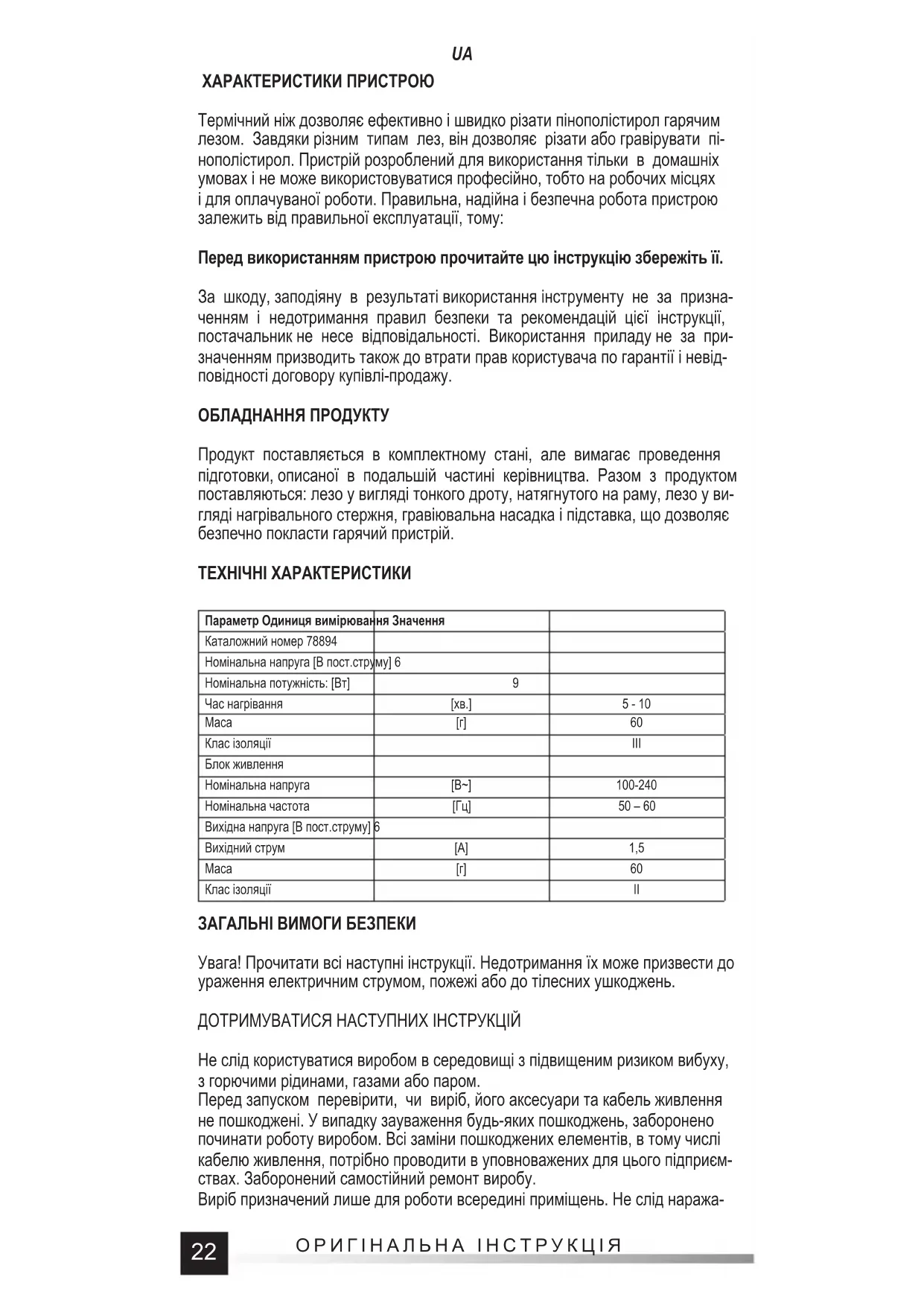 ХАРАКТЕРИСТИКИ ПРИСТРОЮ Термічний ніж дозволяє ефективно і швидко різати пінополістирол гарячим лезом. Завдяки різним типам лез, він дозволяє різати або гравірувати пі- нополістирол. Пристрій розроблений для використання тільки в домашніх умовах і не може використовуватися професійно, тобто на робочих місцях і для оплачуваної роботи. Правильна, надійна і безпечна робота пристрою залежить від правильної експлуатації, тому: Перед використанням пристрою прочитайте цю інструкцію збережіть її. За шкоду, заподіяну в результаті використання інструменту не за призна- ченням і недотримання правил безпеки та рекомендацій цієї інструкції, постачальник не несе відповідальності. Використання приладу не за при- значенням призводить також до втрати прав користувача по гарантії і невід- повідності договору купівлі-продажу. ОБЛАДНАННЯ ПРОДУКТУ Продукт поставляється в комплектному стані, але вимагає проведення підготовки, описаної в подальшій частині керівництва. Разом з продуктом поставляються: лезо у вигляді тонкого дроту, натягнутого на раму, лезо у ви- гляді нагрівального стержня, гравіювальна насадка і підставка, що дозволяє безпечно покласти гарячий пристрій. ТЕХНІЧНІ ХАРАКТЕРИСТИКИ Параметр Одиниця вимірювання Значення Каталожний номер 78894 Номінальна напруга [В пост.струму] 6 Номінальна потужність: [Вт] 9 Час нагрівання [хв.] 5 - 10 Маса [г] 60 Клас ізоляції III Блок живлення Номінальна напруга [В~] 100-240 Номінальна частота [Гц] 50 – 60 Вихідна напруга [В пост.струму] 6 Вихідний струм [A] 1,5 Маса [г] 60 Клас ізоляції II ЗАГАЛЬНІ ВИМОГИ БЕЗПЕКИ Увага! Прочитати всі наступні інструкції. Недотримання їх може призвести до ураження електричним струмом, пожежі або до тілесних ушкоджень. ДОТРИМУВАТИСЯ НАСТУПНИХ ІНСТРУКЦІЙ Не слід користуватися виробом в середовищі з підвищеним ризиком вибуху, з горючими рідинами, газами або паром. Перед запуском перевірити, чи виріб, його аксесуари та кабель живлення не пошкоджені. У випадку зауваження будь-яких пошкоджень, заборонено починати роботу виробом. Всі заміни пошкоджених елементів, в тому числі кабелю живлення, потрібно проводити в уповноважених для цього підприєм- ствах. Заборонений самостійний ремонт виробу. Виріб призначений лише для роботи всередині приміщень. Не слід наража-23 ОРИГІНАЛЬНА ІНСТРУКЦІЯ
