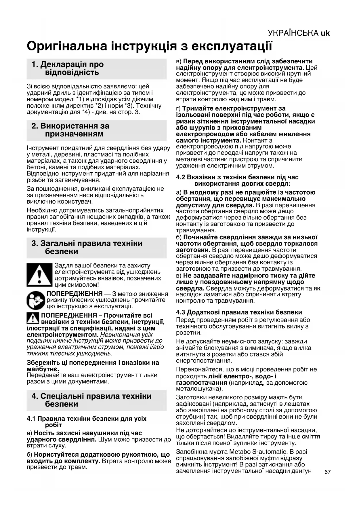 Оригінальна інструкція з експлуатації Зі всією відповідальністю заявляємо: цей ударний дриль з ідентифікацією за типом і номером моделі *1) відповідає усім діючим положенням директив *2) і норм *3). Технічну документацію для *4) - див. на стор. 3. Інструмент придатний для свердління без удару у металі, деревині, пластмасі та подібних матеріалах, а також для ударного свердління у бетоні, камені та подібних матеріалах. Відповідно інструмент придатний для нарізання різьби та загвинчування. За пошкодження, викликані експлуатацією не за призначенням несе відповідальність виключно користувач. Необхідно дотримуватись загальноприйнятих правил запобігання нещасних випадків, а також правил техніки безпеки, наведених в цій інструкції. Задля вашої безпеки та захисту електроінструмента від ушкоджень дотримуйтесь вказівок, позначених цим символом! ПОПЕРЕДЖЕННЯ — З метою зниження ризику тілесних ушкоджень прочитайте цю інструкцію з експлуатації. ПОПЕРЕДЖЕННЯ – Прочитайте всі вказівки з техніки безпеки, інструкції, ілюстрації та специфікації, надані з цим електроінструментом. Невиконання усіх поданих нижче інструкцій може призвести до ураження електричним струмом, пожежі і/або тяжких тілесних ушкоджень. Збережіть ці попередження і вказівки на