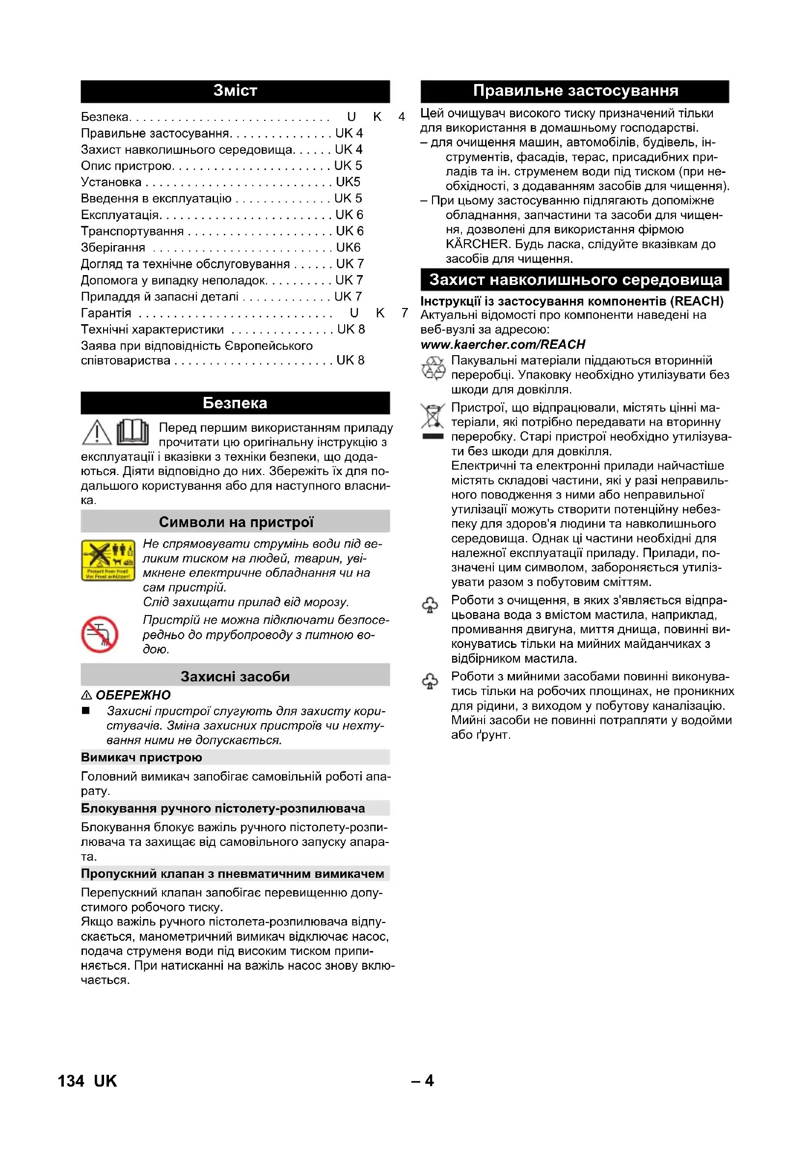 Цей очищувач високого тиску призначений тільки для використання в домашньому господарстві. – для очищення машин, автомобілів, будівель, ін- струментів, фасадів, терас, присадибних при- ладів та ін. струменем води під тиском (при не- обхідності, з додаванням засобів для чищення). – При цьому застосуванню підлягають допоміжне обладнання, запчастини та засоби для чищен- ня, дозволені для використання фірмою KÄRCHER. Будь ласка, слідуйте вказівкам до засобів для чищення. Інструкції із застосування компонентів (REACH) Актуальні відомості про компоненти наведені на веб-вузлі за адресою: www.kaercher.com/REACH