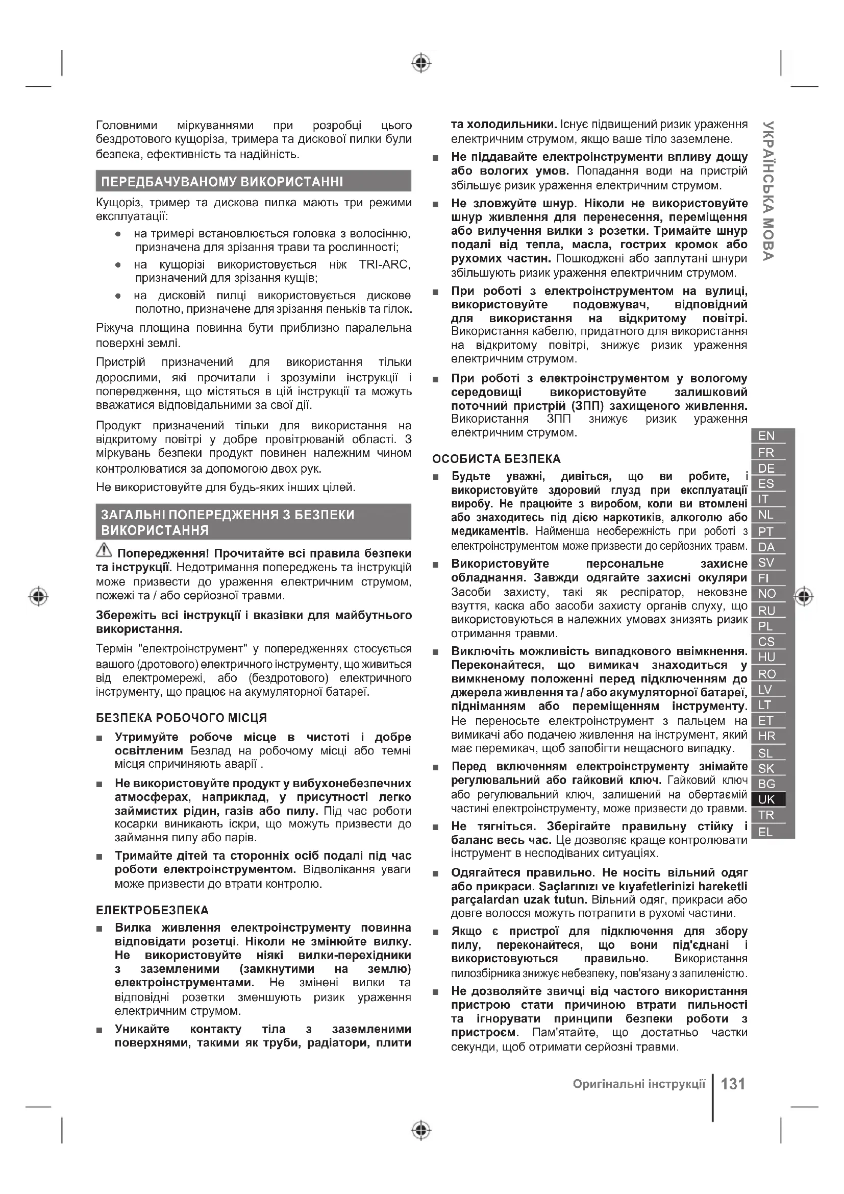 контролюватися за допомогою двох рук. Не використовуйте для будь-яких інших цілей. ЗАГАЛЬНІ ПОПЕРЕДЖЕННЯ З БЕЗПЕКИ ВИКОРИСТАННЯ Попередження! Прочитайте всі правила безпеки та інструкції. Недотримання попереджень та інструкцій може призвести до ураження електричним струмом, пожежі та / або серйозної травми. Збережіть всі інструкції і вказівки для майбутнього використання. Термін "електроінструмент" у попередженнях стосується вашого (дротового) електричного інструменту, що живиться від електромережі, або (бездротового) електричного інструменту, що працює на акумуляторної батареї. БЕЗПЕКА РОБОЧОГО МІСЦЯ ■ Утримуйте робоче місце в чистоті і добре освітленим Безлад на робочому місці або темні місця спричиняють аварії . ■ Не використовуйте продукт у вибухонебезпечних атмосферах, наприклад, у присутності легко займистих рідин, газів або пилу. Під час роботи косарки виникають іскри, що можуть призвести до займання пилу або парів. ■ Тримайте дітей та сторонніх осіб подалі під час роботи електроінструментом. Відволікання уваги може призвести до втрати контролю. ЕЛЕКТРОБЕЗПЕКА ■ Вилка живлення електроінструменту повинна відповідати розетці. Ніколи не змінюйте вилку. Не використовуйте ніякі вилки-перехідники з заземленими (замкнутими на землю) електроінструментами. Не змінені вилки та відповідні розетки зменшують ризик ураження електричним струмом. ■ Уникайте контакту тіла з заземленими поверхнями, такими як труби, радіатори, плити та холодильники. Існує підвищений ризик ураження електричним струмом, якщо ваше тіло заземлене. ■ Не піддавайте електроінструменти впливу дощу або вологих умов. Попадання води на пристрій збільшує ризик ураження електричним струмом. ■ Не зловжуйте шнур. Ніколи не використовуйте шнур живлення для перенесення, переміщення або вилучення вилки з розетки. Тримайте шнур подалі від тепла, масла, гострих кромок або рухомих частин. Пошкоджені або заплутані шнури збільшують ризик ураження електричним струмом. ■ При роботі з електроінструментом на вулиці, використовуйте подовжувач, відповідний для використання на відкритому повітрі. Використання кабелю, придатного для використання на відкритому повітрі, знижує ризик ураження електричним струмом. ■ При роботі з електроінструментом у вологому середовищі використовуйте залишковий поточний пристрій (ЗПП) захищеного живлення. Використання ЗПП знижує ризик ураження електричним струмом. ОСОБИСТА БЕЗПЕКА ■ Будьте уважні, дивіться, що ви робите, і використовуйте здоровий глузд при експлуатації виробу. Не працюйте з виробом, коли ви втомлені або знаходитесь під дією наркотиків, алкоголю або медикаментів. Найменша необережність при роботі з електроінструментом може призвести до серйозних травм. ■ Використовуйте персональне захисне обладнання. Завжди одягайте захисні окуляри Засоби захисту, такі як респіратор, нековзне взуття, каска або засоби захисту органів слуху, що використовуються в належних умовах знизять ризик отримання травми. ■ Виключіть можливість випадкового ввімкнення. Переконайтеся, що вимикач знаходиться у вимкненому положенні перед підключенням до джерела живлення та / або акумуляторної батареї, підніманням або переміщенням інструменту. Не переносьте електроінструмент з пальцем на вимикачі або подачею живлення на інструме