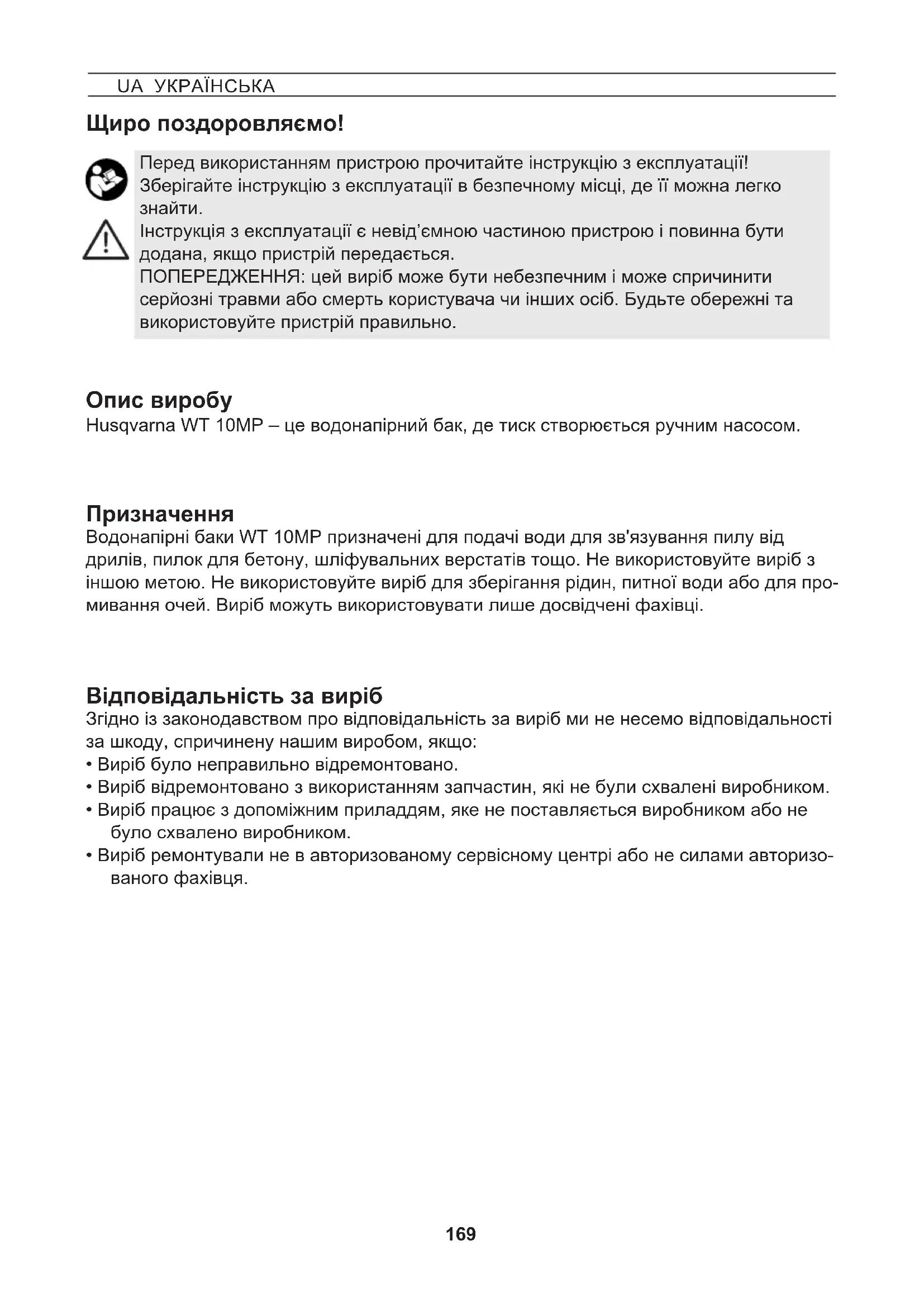 UA УКРАЇНСЬКА Щиро поздоровляємо! Husqvarna WT 10MP – це водонапірний бак, де тиск створюється ручним насосом. Опис виробу Призначення Перед використанням пристрою прочитайте інструкцію з експлуатації! Зберігайте інструкцію з експлуатації в безпечному місці, де її можна легко