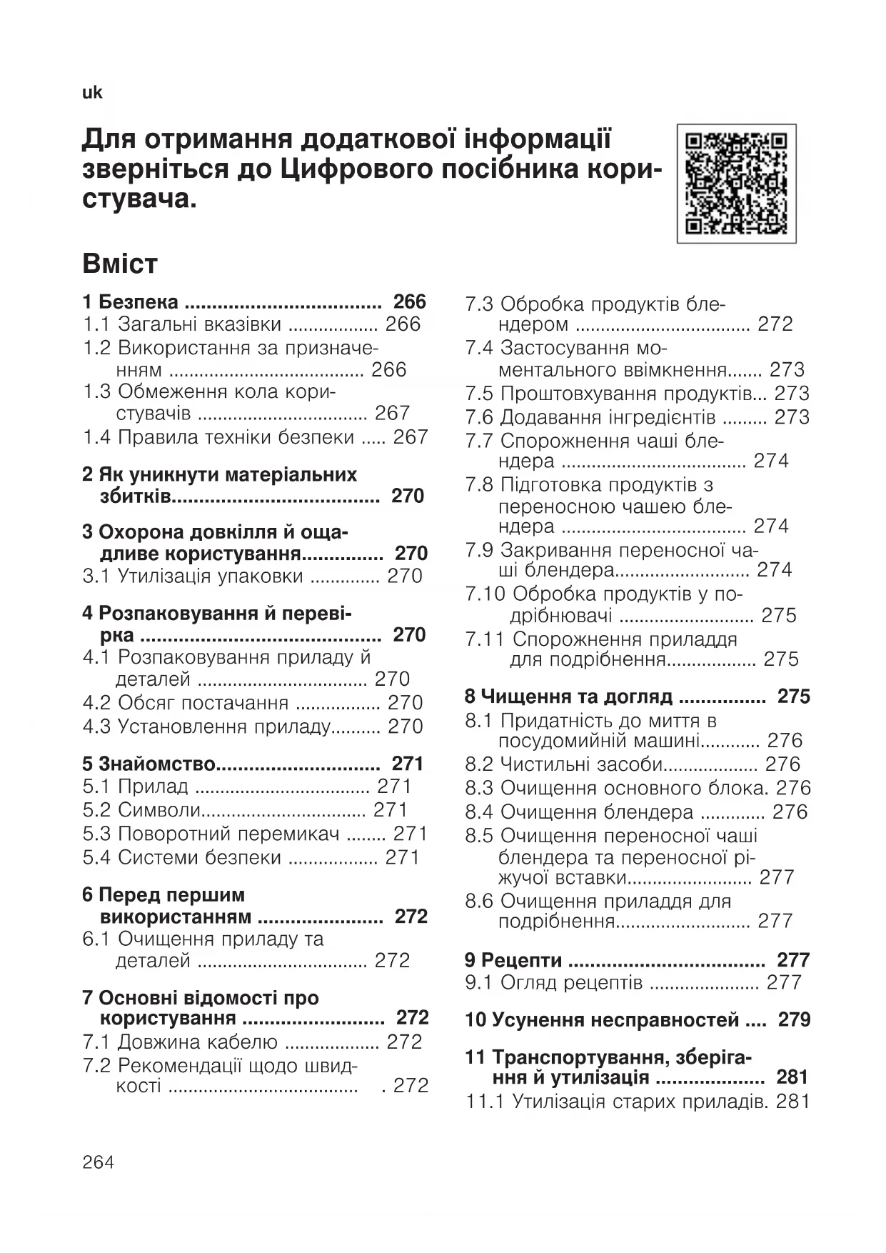 1 Безпека Дотримуйтеся наступних правил техніки безпеки. 1.1 Загальні вказівки ¡ Будь ласка, уважно прочитайте цю інструкцію. ¡ Збережіть інструкцію й інформацію про прилад для пізнішого користування або для наступного власника приладу. ¡ Не підключайте прилад, якщо його пошкоджено під час транспортування. 1.2 Використання за призначенням Користуйтеся приладом лише за таких умов: ¡ з оригінальним приладдям. ¡ для подрібнення, січення, змішування, перемелювання та взбивання продуктів. ¡ Для переробки у блендері та приготування пюре. ¡ щоб готувати млинцеве тісто, сорбети, бутербродні маси, соуси й морозиво. ¡ для подрібнювання кубиків льоду. ¡ під наглядом. ¡ у приватних домогосподарствах і в закритих приміщеннях побутового призначення за кімнатної температури. ¡ для обробки продуктів у кількості і з тривалістю, звичайними для домашнього господарства. ¡ на висоті щонайбільше 2000м над рівнем моря. ¡ щоб робити смузі з фруктів і овочів. Від’єднуйте прилад від електромережі, коли ви: ¡ не використовуйте прилад. ¡ залишаєте прилад без нагляду. ¡ збираєте прилад. ¡ розбираєте прилад. ¡ чистите прилад. ¡ наближаєтеся до деталей, що обертаються. ¡ зіткнулися з несправністю.Безпека uk
