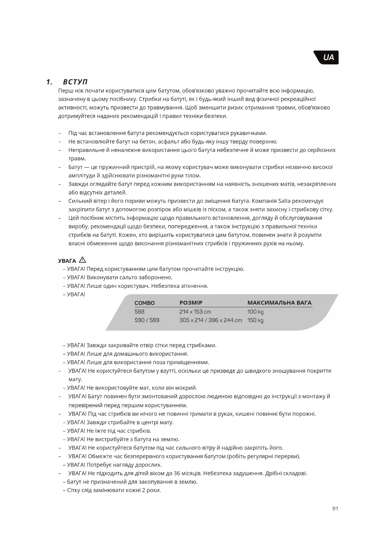 – Батут — це пружинний пристрій, на якому користувач може виконувати стрибки незвично високої амплітуди й здійснювати різноманітні рухи тілом. – Завжди оглядайте батут перед кожним використанням на наявність зношених матів, незакріплених або відсутніх деталей. – Сильний вітер і його пориви можуть призвести до зміщення батута. Компанія Salta рекомендує закріпити батут з допомогою розпірок або мішків із піском, а також зняти захисну і стрибкову сітку. – Цей посібник містить інформацію щодо правильного встановлення, догляду й обслуговування виробу, рекомендації щодо безпеки, попередження, а також інструкцію з правильної техніки стрибків на батуті. Кожен, хто вирішить користуватися цим батутом, повинен знати й розуміти власні обмеження щодо виконання різноманітних стрибків і пружинних рухів на ньому.