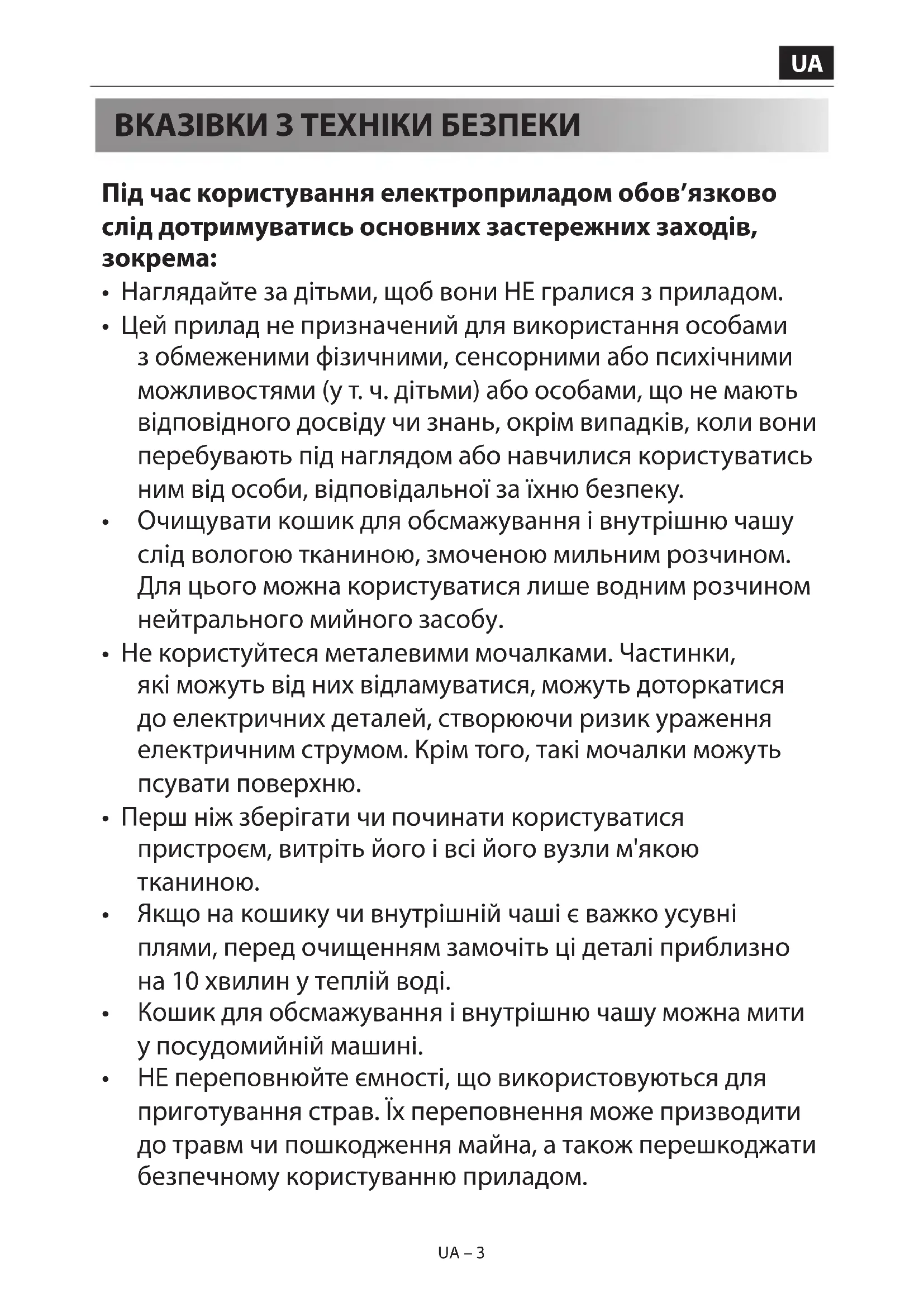 - Щоб внутрішня чаша не впала на підлогу, перед вийманням кошика для обсмажування її слід поставити на стійку поверхню.UA UA – 4UA – 4
