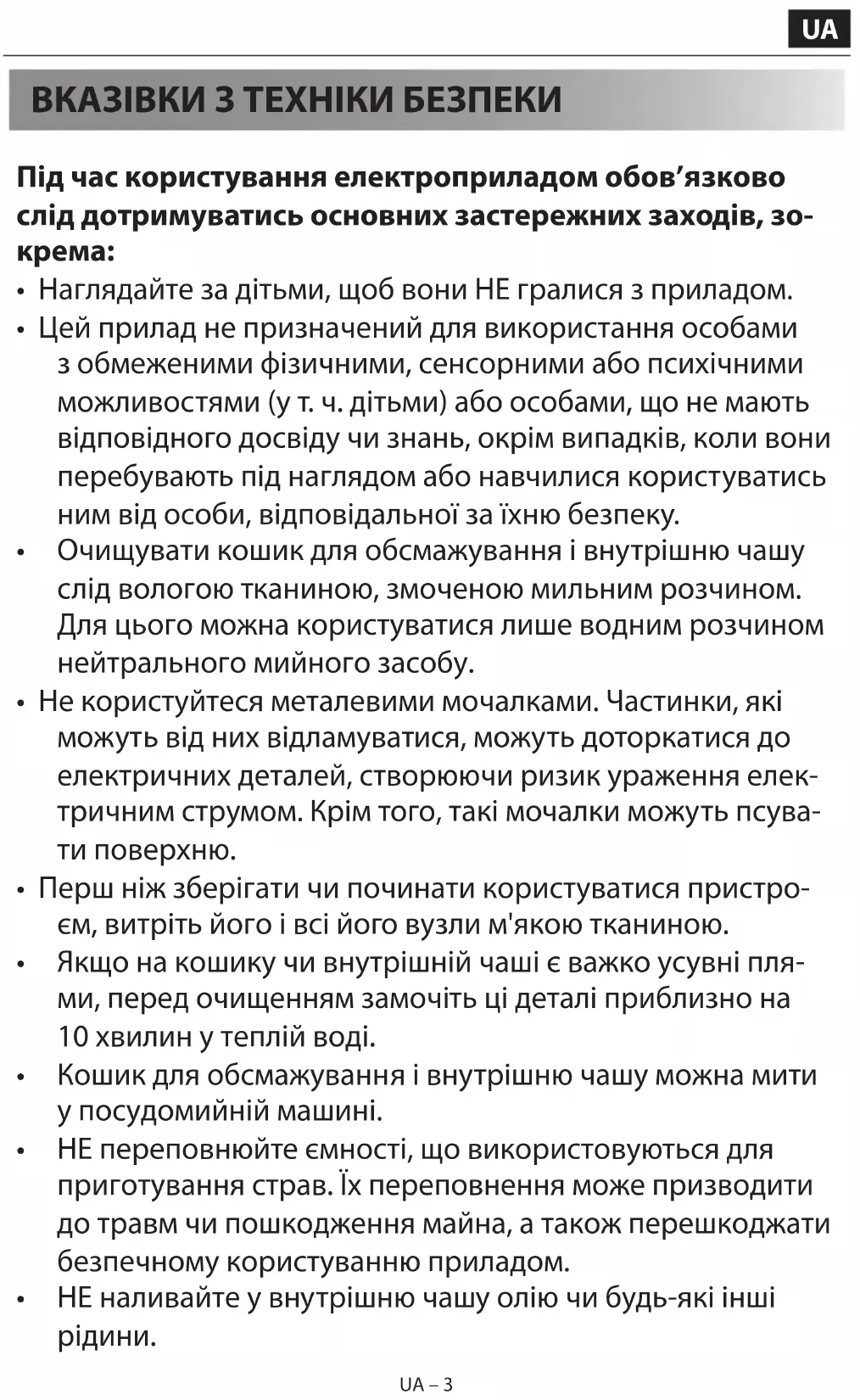 - НЕ наливайте у внутрішню чашу олію чи будь-які інші рідини.UA – 4 UA – 4