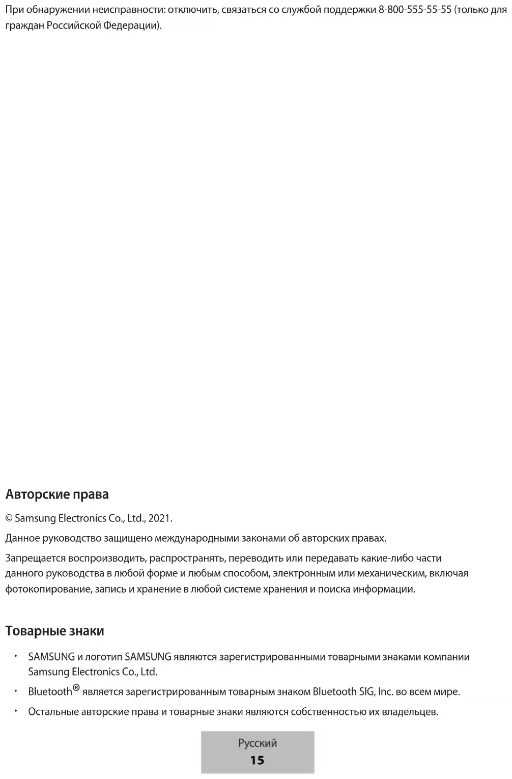 14Авторське право © Samsung Electronics Co., Ltd., 2021 Цей посібник користувача захищено згідно з міжнародними законами щодо авторських прав. Заборонено відтворювати, розповсюджувати, перекладати або передавати в будь-якій формі або будь-якими засобами, електронними або механічними, включно із ксерокопіюванням, записуванням або зберіганням на будь-якому пристрої для зберігання даних чи в інформаційно-пошуковій системі, жодну частину цього посібника. Товарні знаки