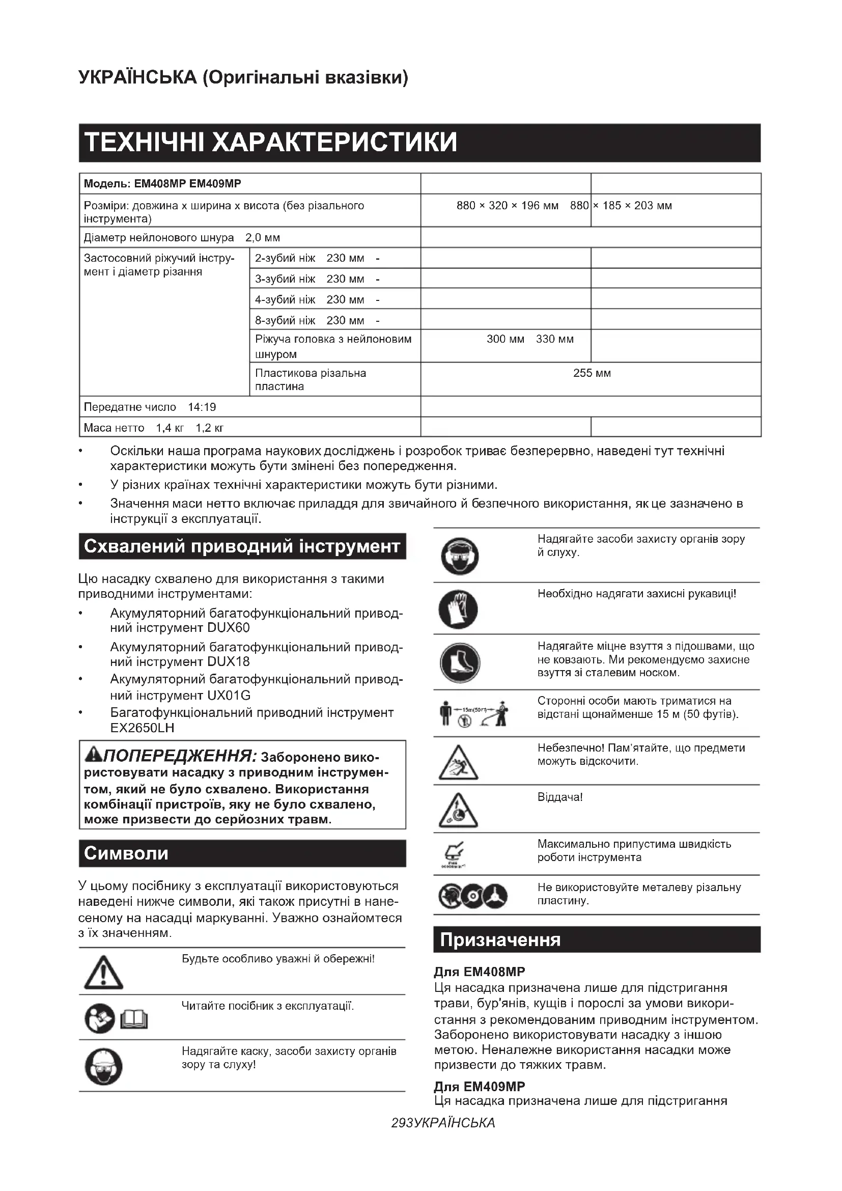 Призначення Для EM408MP Цянасадкапризначеналишедляпідстригання трави,бур'янів,кущівіпорослізаумовивикори- станнязрекомендованимприводнимінструментом. Забороненовикористовуватинасадкузіншою метою.Неналежневикористаннянасадкиможе призвестидотяжкихтравм. Для EM409MP Цянасадкапризначеналишедляпідстригання294 УКРАЇНСЬКА травийневеликихбур'янівзаумовивикористання зрекомендованимприводнимінструментом. Забороненовикористовуватинасадкузіншою метою.Неналежневикористаннянасадкиможе призвестидотяжкихтравм. ПОПЕРЕДЖЕННЯ: Перед початком роботи прочитайте інструкцію з експлуатації насадки, а також цю інструкцію з експлуатації. Недотриманнявідповіднихзастереженьйінструк- ційможепризвестидосерйознихтравм. Декларація про відповідність стандартам ЄС Тільки для країн Європи Ми,виробникицьогообладнання:компаніяMakita Europe N.V.,юридичнаадреса:Jan-Baptist Vinkstraat 2 3070 Kortenberg BELGIUM(Бельгія). УповноважуємоKazuhisa Makinoскластитехнічну документаціютапідсвоювиключнувідповідальність заявляємопроте,щовиріб; Позначення:насадка-травокосарка.Моделі: EM408MP / EM409MP. відповідаютьусімзастосовнимвимогамдирективи 2006/42/EC,атакожвідповідаютьусімзасто- совнимвимогамтакихдирективЄС,як2000/14/ EC,івиробляютьсязгіднозтакимигармонізо- ванимистандартами:EN ISO 11806-1:2022, EN 62841-1:2015+A11:2022. Місцейдатаскладаннязаяви:Kortenberg, Belgium (Бельгія). 1. 8. 2024 Відповідальнаособа:Kazuhisa Makino, директор компанії Makita Europe N.V. ПОПЕРЕДЖЕННЯ ПРО ДОТРИМАННЯ ТЕХНІКИ