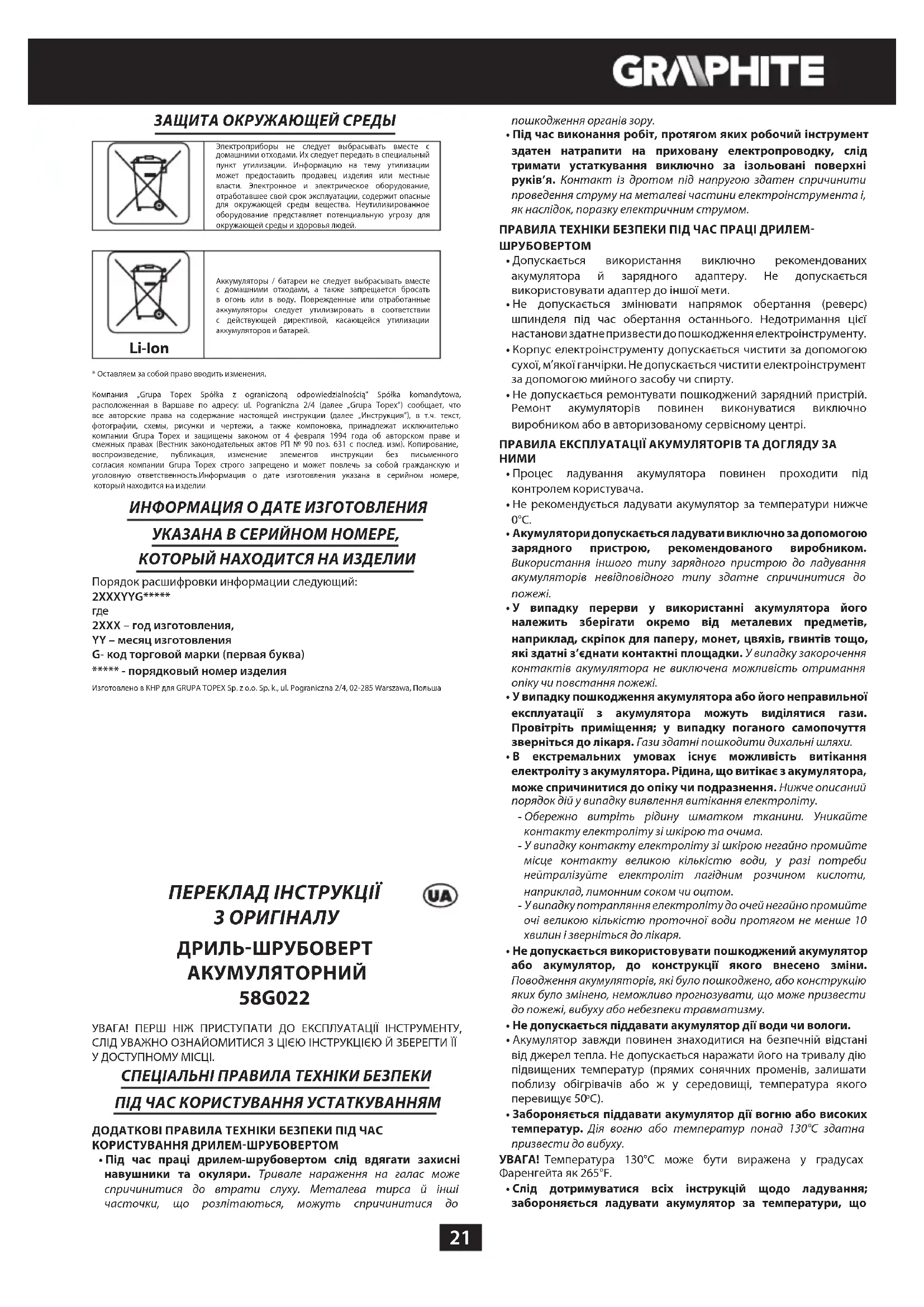 58G022 - дриль Graphite - Безкоштовний посібник користувача