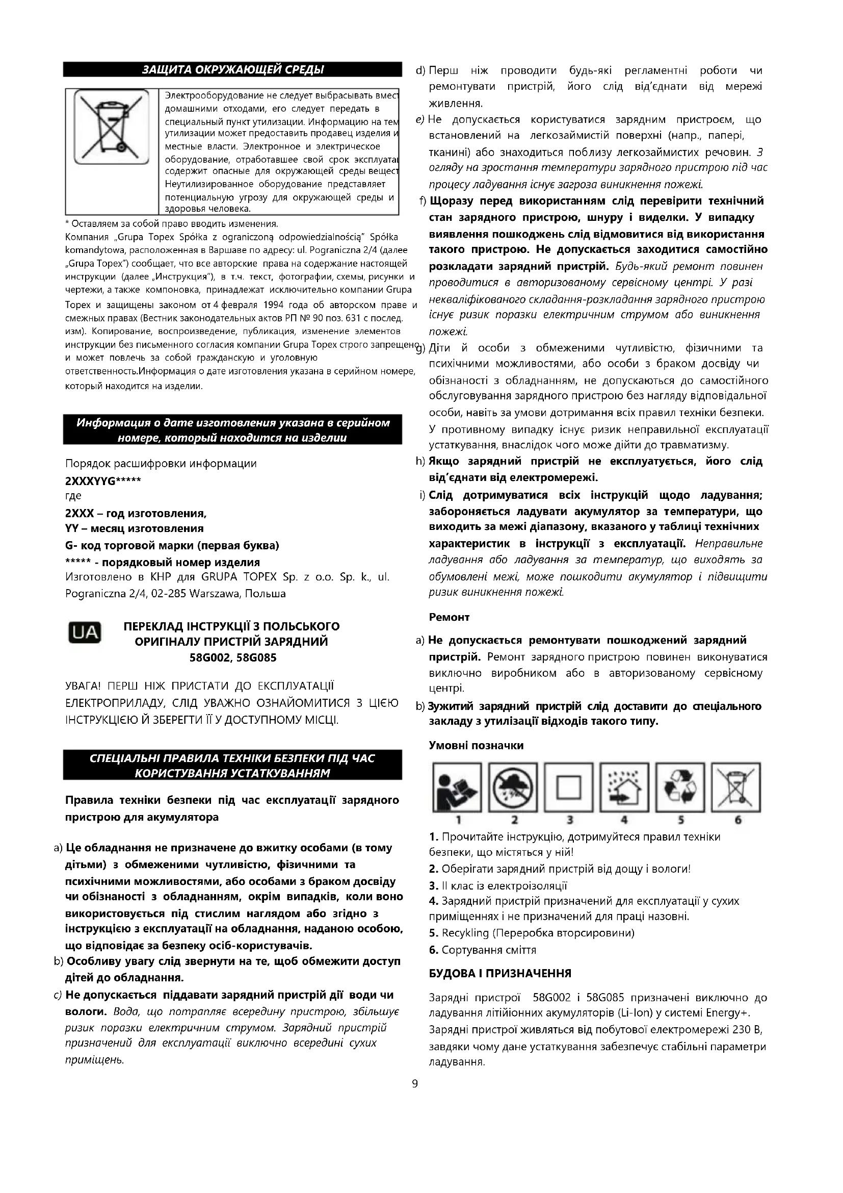 2ХХХ – год изготовления, YY – месяц изготовления G- код торговой марки (первая буква) ***** - порядковый номер изделия Изготовлено в КНР для GRUPA TOPEX Sp. z o.o. Sp. k., ul. Pograniczna 2/4, 02-285 Warszawa, Польша ПЕРЕКЛАД ІНСТРУКЦІЇ З ПОЛЬСЬКОГО ОРИГІНАЛУ ПРИСТРІЙ ЗАРЯДНИЙ 58G002, 58G085 УВАГА! ПЕРШ НІЖ ПРИСТАТИ ДО ЕКСПЛУАТАЦІЇ ЕЛЕКТРОПРИЛАДУ, СЛІД УВАЖНО ОЗНАЙОМИТИСЯ З ЦІЄЮ ІНСТРУКЦІЄЮ Й ЗБЕРЕГТИ ЇЇ У ДОСТУПНОМУ МІСЦІ. СПЕЦІАЛЬНІ ПРАВИЛА ТЕХНІКИ БЕЗПЕКИ ПІД ЧАС КОРИСТУВАННЯ УСТАТКУВАННЯМ Правила техніки безпеки під час експлуатації зарядного пристрою для акумулятора a) Це обладнання не призначене до вжитку особами (в тому дітьми) з обмеженими чутливістю, фізичними та психічними можливостями, або особами з браком досвіду чи обізнаності з обладнанням, окрім випадків, коли воно використовується під стислим наглядом або згідно з інструкцією з експлуатації на обладнання, наданою особою, що відповідає за безпеку осіб-користувачів. b) Особливу увагу слід звернути на те, щоб обмежити доступ дітей до обладнання. c) Не допускається піддавати зарядний пристрій дії води чи вологи. Вода, що потрапляє всередину пристрою, збільшує ризик поразки електричним струмом. Зарядний пристрій призначений для експлуатації виключно всередині сухих