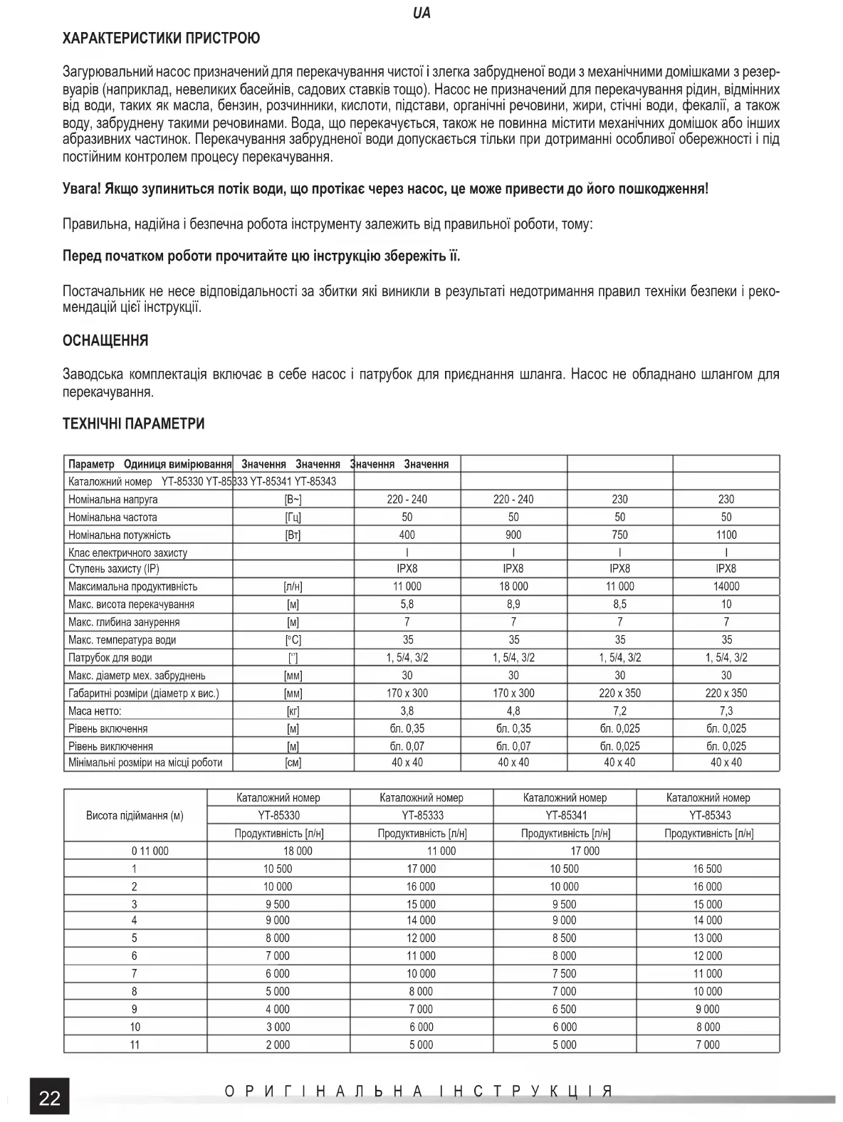 Заводська комплектація включає в себе насос і патрубок для приєднання шланга. Насос не обладнано шлангом для перекачування. ТЕХНІЧНІ ПАРАМЕТРИ Параметр Одиниця вимірювання Значення Значення Значення Значення Каталожний номер YT-85330 YT-85333 YT-85341 YT-85343 Номінальна напруга [В~] 220 - 240 220 - 240 230 230 Номінальна частота [Гц] 50505050 Номінальна потужність [Вт] 400 900 750 1100 Клас електричного захисту IIII Ступень захисту (IP) IPX8 IPX8 IPX8 IPX8 Максимальна продуктивність [л/н] 11 000 18 000 11 000 14000 Макс. висота перекачування [м] 5,8 8,9 8,5 10 Макс. глибина занурення [м]7777 Макс. температура води [