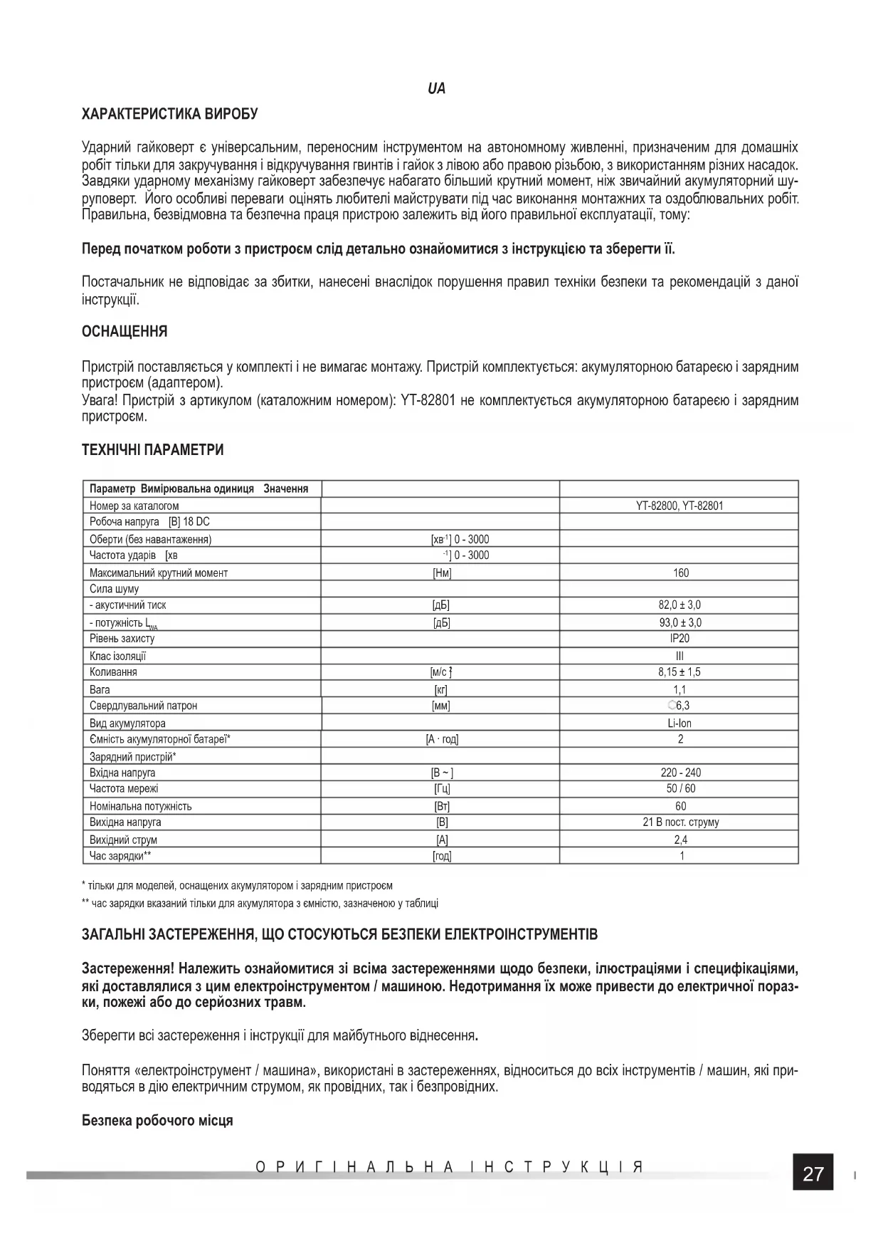 ПОСІБНИК КОРИСТУВАЧА YT-82800 Yato