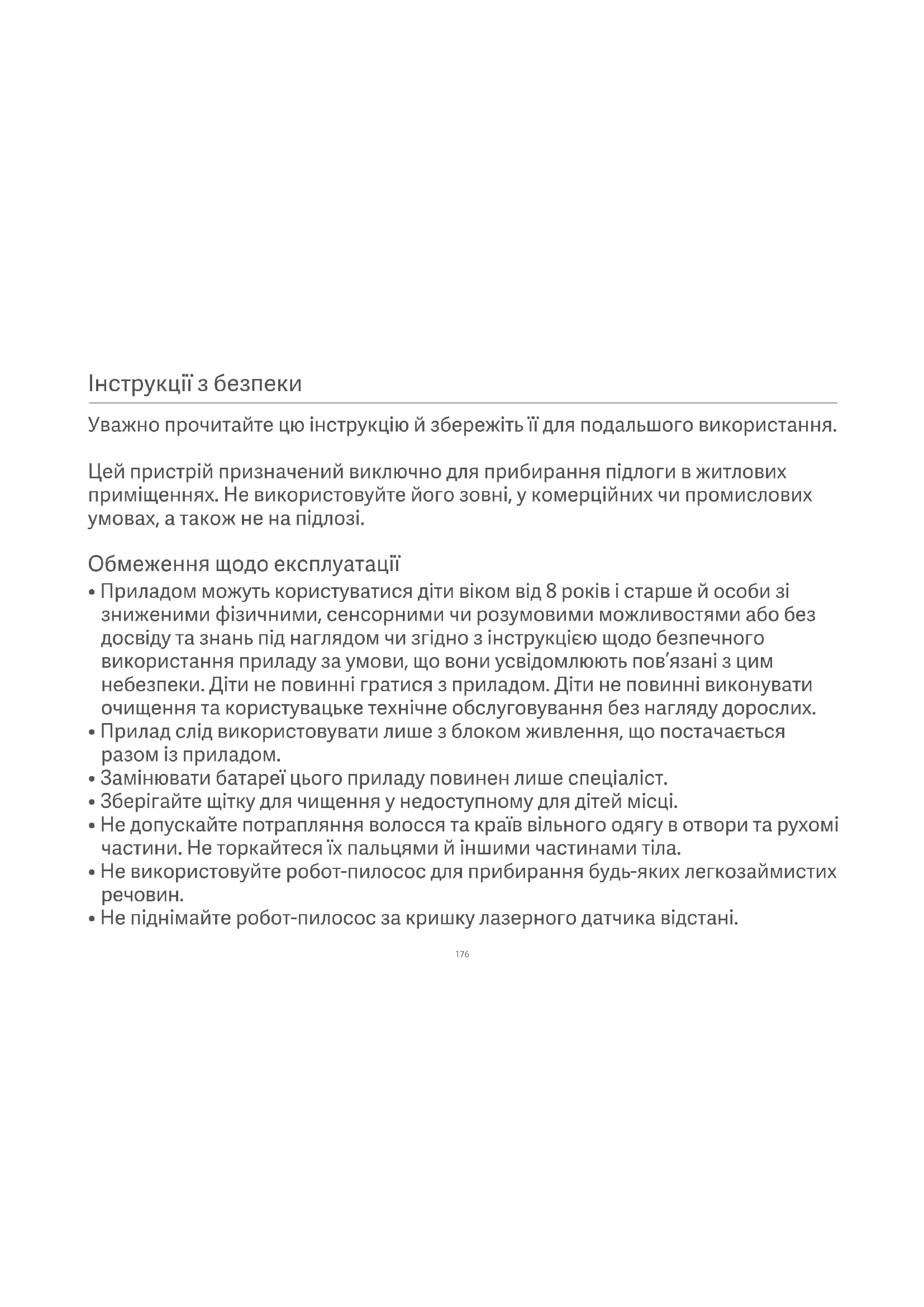 - Не піднімайте робот-пилосос за кришку лазерного датчика відстані. Уважно прочитайте цю інструкцію й збережіть її для подальшого використання. Цей пристрій призначений виключно для прибирання підлоги в житлових приміщеннях. Не використовуйте його зовні, у комерційних чи промислових умовах, а також не на підлозі.177