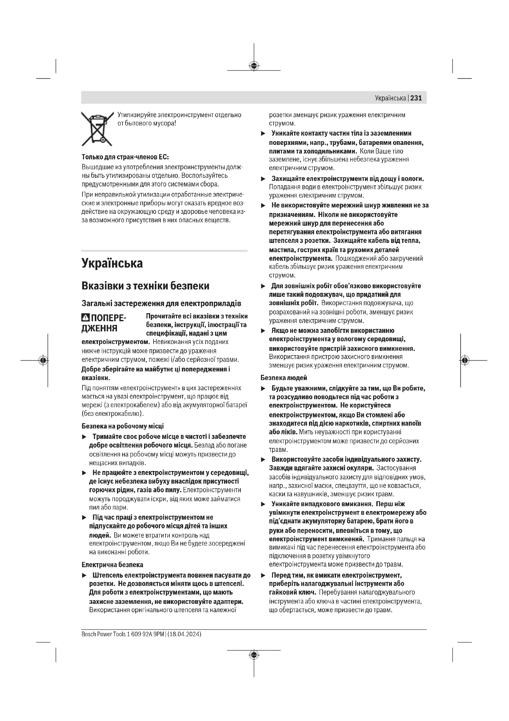u Використовуйте засоби індивідуального захисту. Завжди вдягайте захисні окуляри. Застосування засобів індивідуального захисту для відповідних умов, напр.,захисної маски, спецвзуття, що не ковзається, каски та навушників, зменшує ризик травм. u Уникайте випадкового вмикання. Перш ніж увімкнути електроінструмент в електромережу або під’єднати акумуляторну батарею, брати його в руки або переносити, впевніться в тому, що електроінструмент вимкнений. Тримання пальця на вимикачі під час перенесення електроінструмента або підключення в розетку увімкнутого електроінструмента може призвести до травм. u Перед тим, як вмикати електроінструмент, приберіть налагоджувальні інструменти або гайковий ключ. Перебування налагоджувального інструмента або ключа в частині електроінструмента, що обертається, може призвести до травм. Bosch Power Tools 1 609 92A 9PM | (18.04.2024)232 | Українська u Уникайте неприродного положення тіла. Завжди зберігайте стійке положення та тримайте рівновагу. Це дозволить Вам краще контролювати електроінструмент у небезпечних ситуаціях. u Вдягайте придатний одяг. Не вдягайте просторий одяг та прикраси. Не підставляйте волосся й одяг до деталей, що рухаються. Просторий одяг, довге волосся та прикраси можуть потрапити в деталі, що