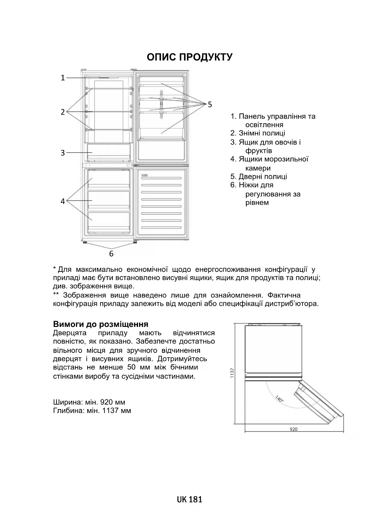 - Для максимально економічної щодо енергоспоживання конфігурації у приладі має бути встановлено висувні ящики, ящик для продуктів та полиці; див. зображення вище. ** Зображення вище наведено лише для ознайомлення. Фактична конфігурація приладу залежить від моделі або специфікації дистриб’ютора. Вимоги до розміщення Дверцята приладу мають відчинятися повністю, як показано. Забезпечте достатньо вільного місця для зручного відчинення дверцят і висувних ящиків. Дотримуйтесь відстань не менше 50 мм між бічними стінками виробу та сусідніми частинами. Ширина: мін. 920 мм Глибина: мін. 1137 мм