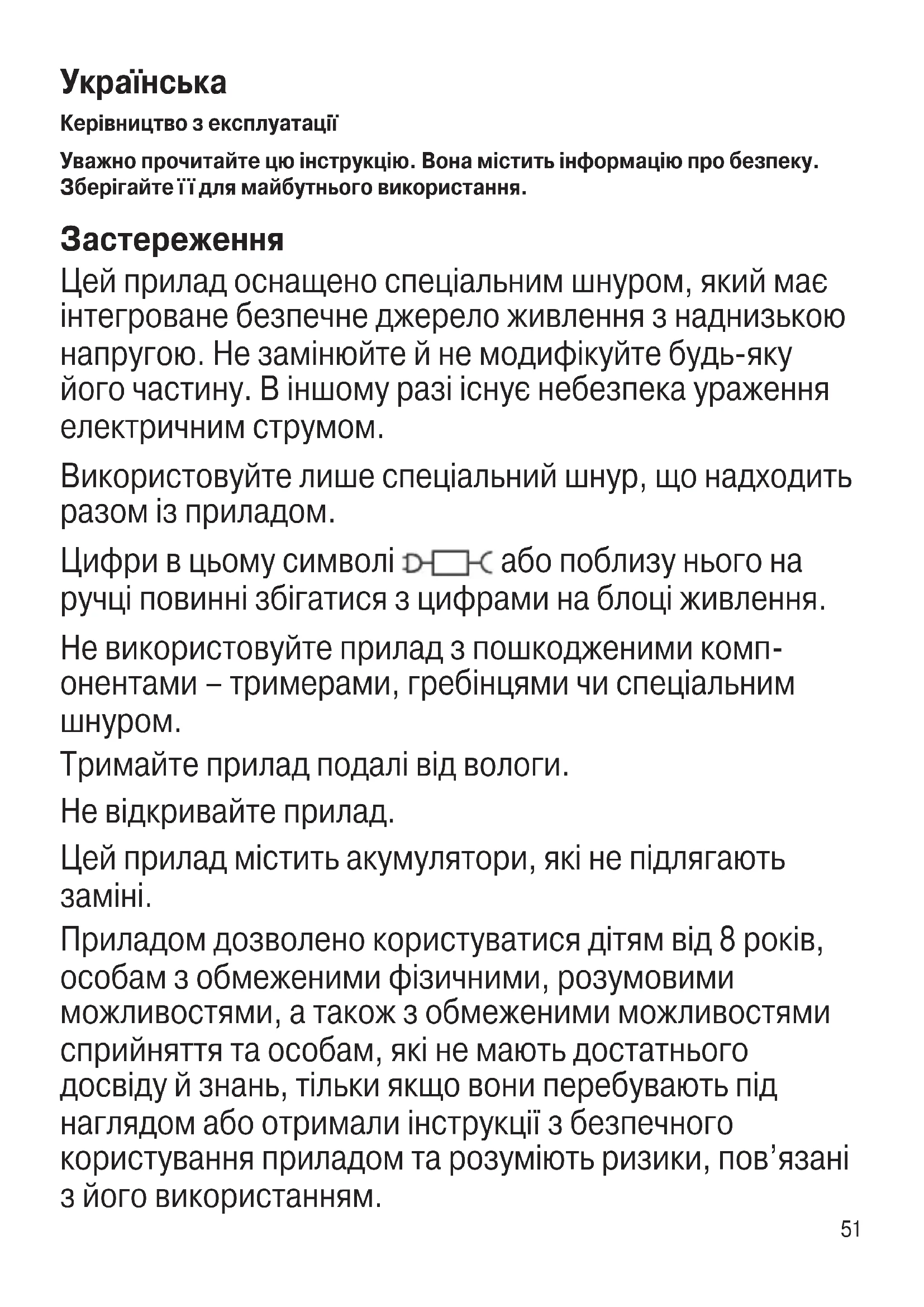 Керівництво з експлуатації Уважно прочитайте цю інструкцію. Вона містить інформацію про безпеку. Зберігайте ї ї для майбутнього використання. Застереження Цей прилад оснащено спеціальним шнуром, який має інтегроване безпечне джерело живлення з наднизькою напругою. Не замінюйте й не модифікуйте будь-яку його частину. В іншому разі існує небезпека ураження електричним струмом. Використовуйте лише спеціальний шнур, що надходить разом із приладом. Цифри в цьому символі або поблизу нього на ручці повинні збігатися з цифрами на блоці живлення. Не використовуйте прилад з пошкодженими комп- онентами – тримерами, гребінцями чи спеціальним