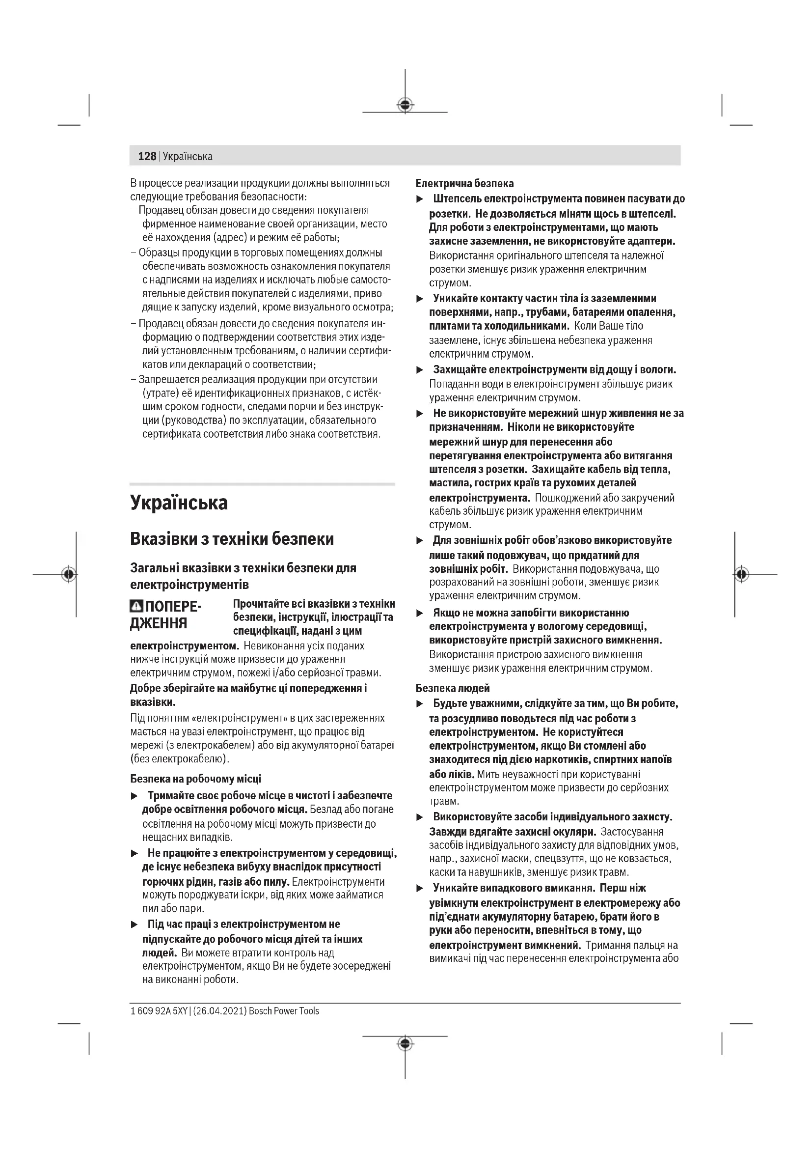 u Використовуйте засоби індивідуального захисту. Завжди вдягайте захисні окуляри. Застосування засобів індивідуального захисту для відповідних умов, напр.,захисної маски, спецвзуття, що не ковзається, каски та навушників, зменшує ризик травм. u Уникайте випадкового вмикання. Перш ніж увімкнути електроінструмент в електромережу або під’єднати акумуляторну батарею, брати його в руки або переносити, впевніться в тому, що електроінструмент вимкнений. Тримання пальця на вимикачі під час перенесення електроінструмента або 1 609 92A 5XY | (26.04.2021) Bosch Power ToolsУкраїнська | 129 підключення в розетку увімкнутого електроінструмента може призвести до травм. u Перед тим, як вмикати електроінструмент, приберіть налагоджувальні інструменти або гайковий ключ. Перебування налагоджувального інструмента або ключа в частині електроінструмента, що обертається, може призвести до травм. u Уникайте неприродного положення тіла. Завжди зберігайте стійке положення та тримайте рівновагу. Це дозволить Вам краще контролювати електроінструмент у небезпечних ситуаціях. u Вдягайте придатний одяг. Не вдягайте просторий одяг та прикраси. Не підставляйте волосся й одяг до деталей, що рухаються. Просторий одяг, довге волосся та прикраси можуть потрапити в деталі, що