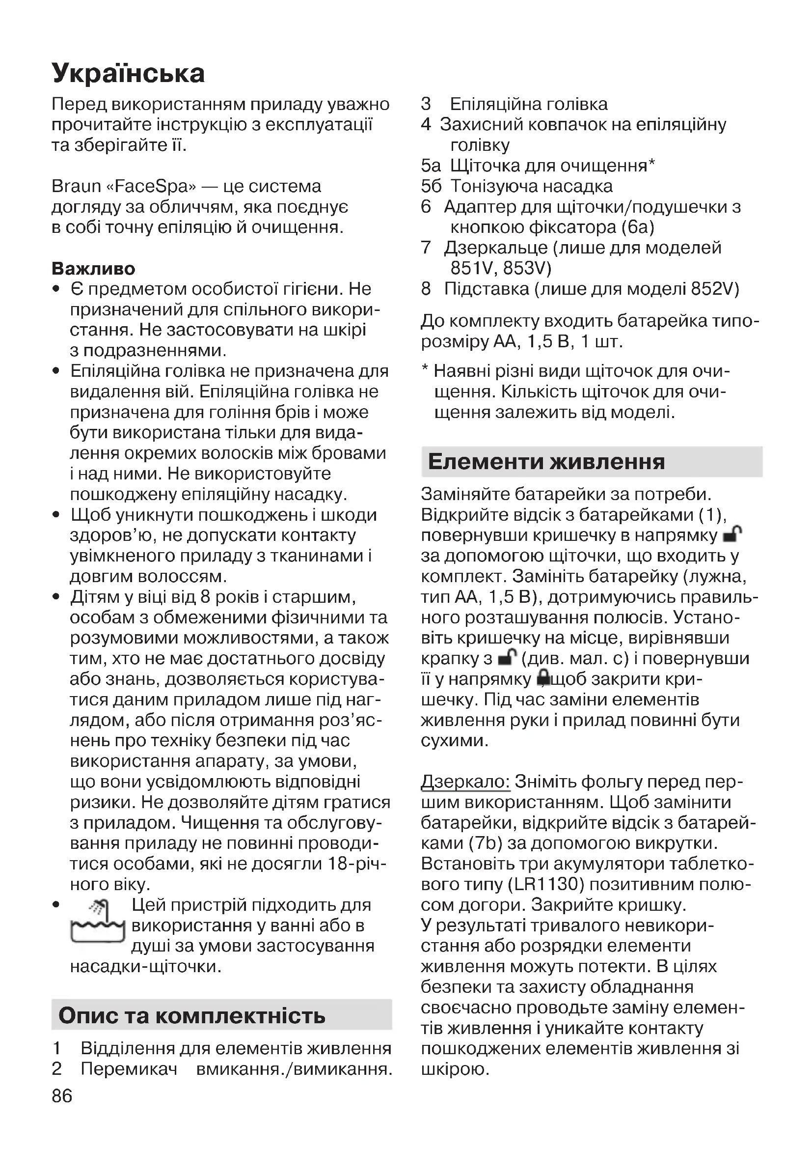 5а Щіточка для очищення* 5б Тонізуюча насадка 6 Адаптер для щіточки/подушечки з кнопкою фіксатора (6а) 7 Дзеркальце (лише для моделей 851V, 853V) 8 Підставка (лише для моделі 852V) До комплекту входить батарейка типо- розміру АА, 1,5 В, 1 шт.