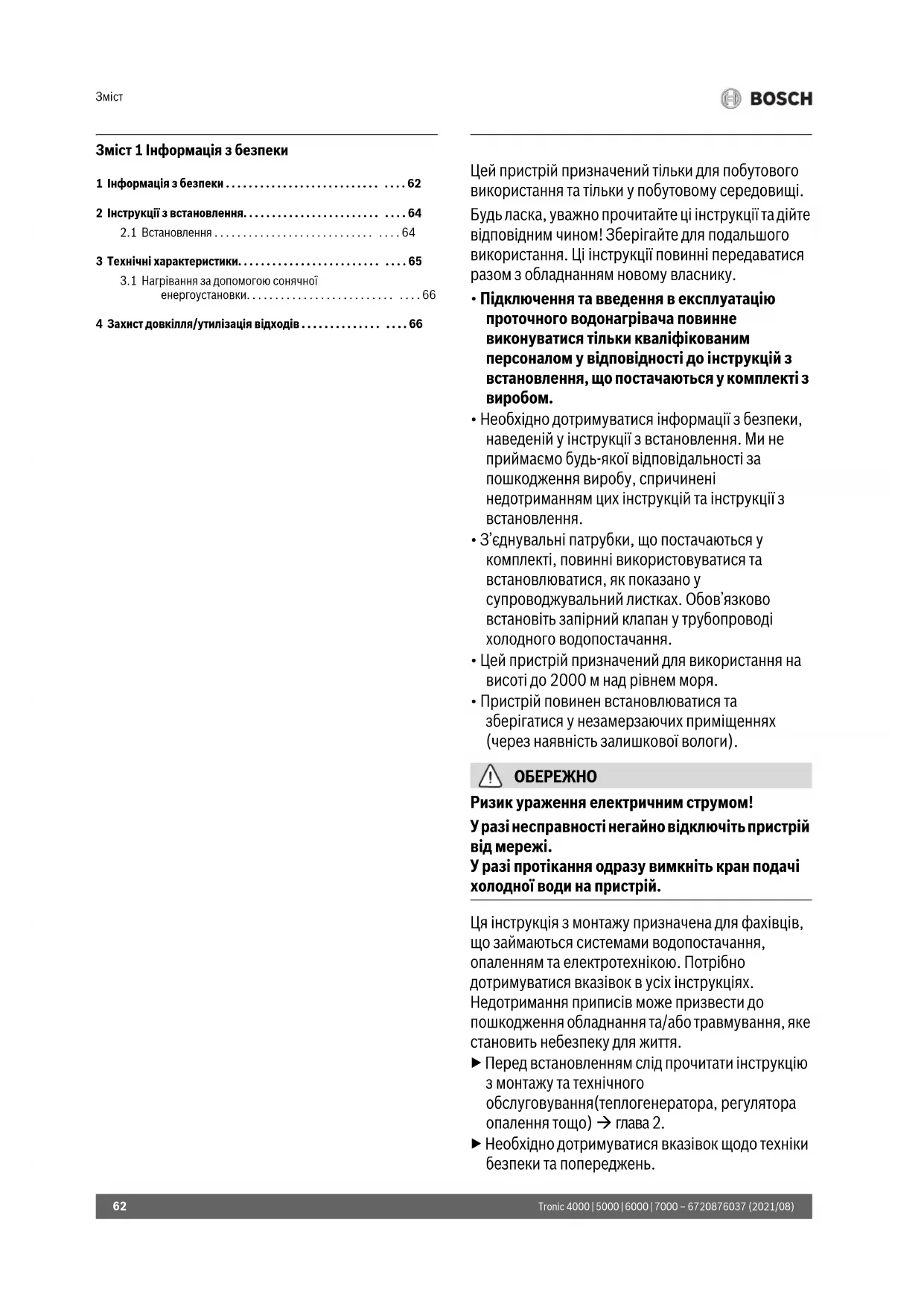 Ризик ураження електричним струмом! У разі несправності негайно відключіть пристрій від мережі. У разі протікання одразу вимкніть кран подачі холодної води на пристрій. Ця інструкція з монтажу призначена для фахівців, що займаються системами водопостачання, опаленням та електротехнікою. Потрібно дотримуватися вказівок в усіх інструкціях. Недотримання приписів може призвести до пошкодження обладнання та/або травмування, яке становить небезпеку для життя. ▶ Перед встановленням слід прочитати інструкцію з монтажу та технічного обслуговування(теплогенератора, регулятора опалення тощо) глава 2. ▶ Необхідно дотримуватися вказівок щодо техніки безпеки та попереджень. 1 Інформація з безпеки . . . . . . . . . . . . . . . . . . . . . . . . . . . . . . . 62 2 Інструкції з встановлення. . . . . . . . . . . . . . . . . . . . . . . . . . . . 64