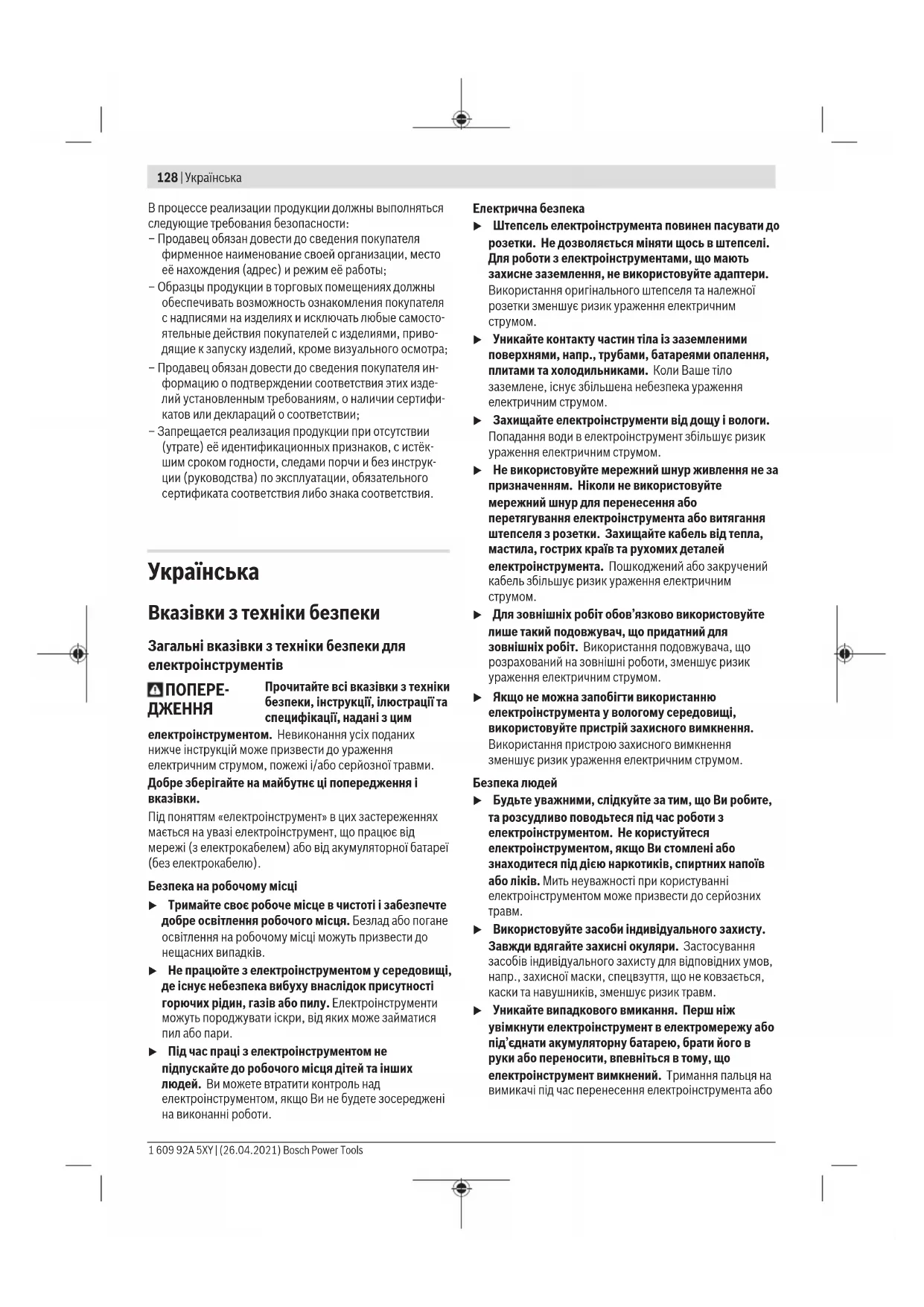 u Використовуйте засоби індивідуального захисту. Завжди вдягайте захисні окуляри. Застосування засобів індивідуального захисту для відповідних умов, напр.,захисної маски, спецвзуття, що не ковзається, каски та навушників, зменшує ризик травм. u Уникайте випадкового вмикання. Перш ніж увімкнути електроінструмент в електромережу або під’єднати акумуляторну батарею, брати його в руки або переносити, впевніться в тому, що електроінструмент вимкнений. Тримання пальця на вимикачі під час перенесення електроінструмента або 1 609 92A 5XY | (26.04.2021) Bosch Power ToolsУкраїнська | 129 підключення в розетку увімкнутого електроінструмента може призвести до травм. u Перед тим, як вмикати електроінструмент, приберіть налагоджувальні інструменти або гайковий ключ. Перебування налагоджувального інструмента або ключа в частині електроінструмента, що обертається, може призвести до травм. u Уникайте неприродного положення тіла. Завжди зберігайте стійке положення та тримайте рівновагу. Це дозволить Вам краще контролювати електроінструмент у небезпечних ситуаціях. u Вдягайте придатний одяг. Не вдягайте просторий одяг та прикраси. Не підставляйте волосся й одяг до деталей, що рухаються. Просторий одяг, довге волосся та прикраси можуть потрапити в деталі, що
