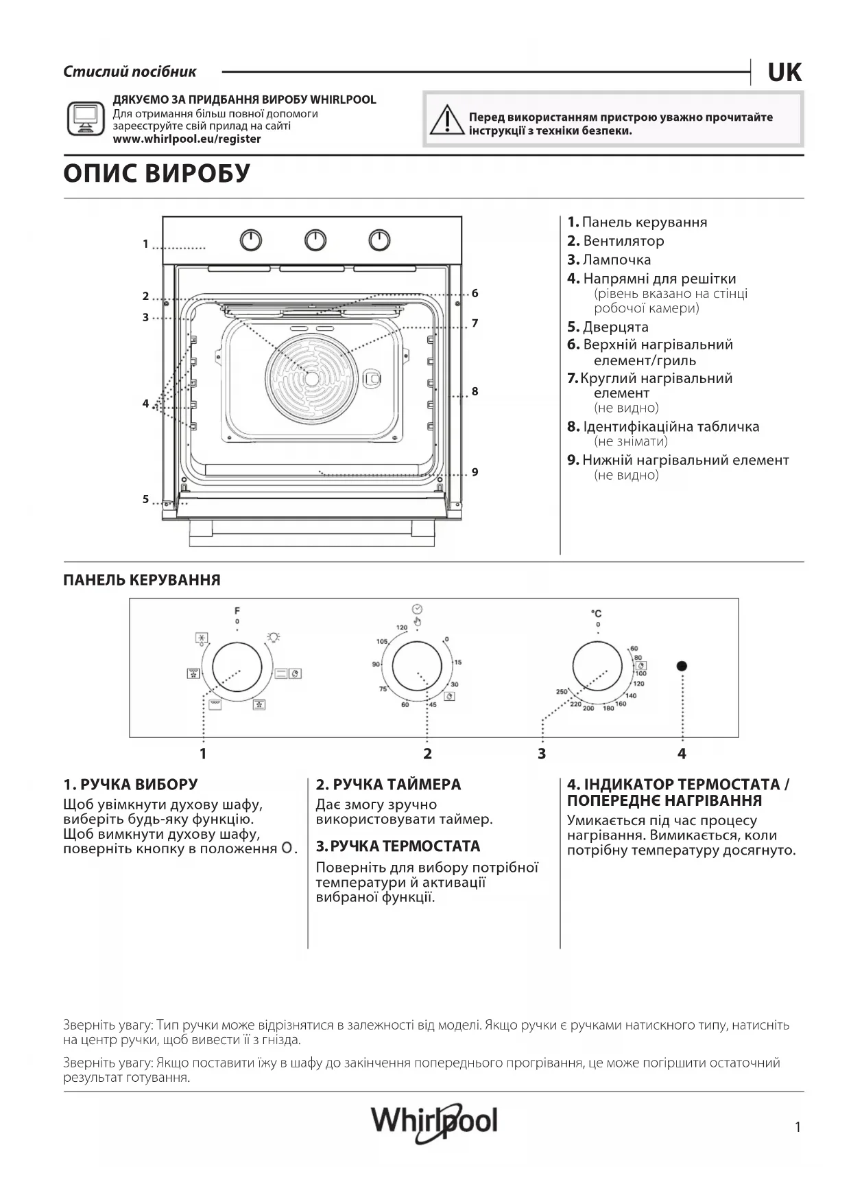 Стислий посібник ДЯКУЄМО ЗА ПРИДБАННЯ ВИРОБУ WHIRLPOOL Для отримання більш повної допомоги зареєструйте свій прилад на сайті www.whirlpool.eu/register Перед використанням пристрою уважно прочитайте інструкції з техніки безпеки. ОПИС ВИРОБУ ПАНЕЛЬ КЕРУВАННЯ