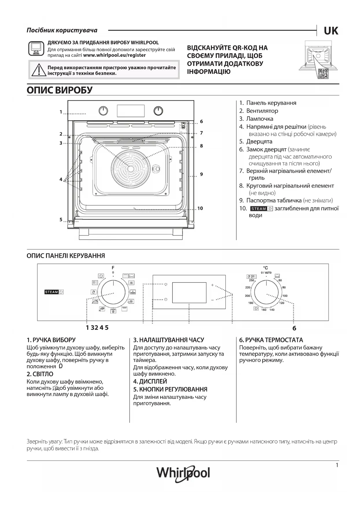 Посібник користувача ДЯКУЄМО ЗА ПРИДБАННЯ ВИРОБУ WHIRLPOOLДля отримання більш повної допомоги зареєструйте свій прилад на сайті www.whirlpool.eu/register ВІДСКАНУЙТЕ QR-КОД НА СВОЄМУ ПРИЛАДІ, ЩОБ ОТРИМАТИ ДОДАТКОВУ