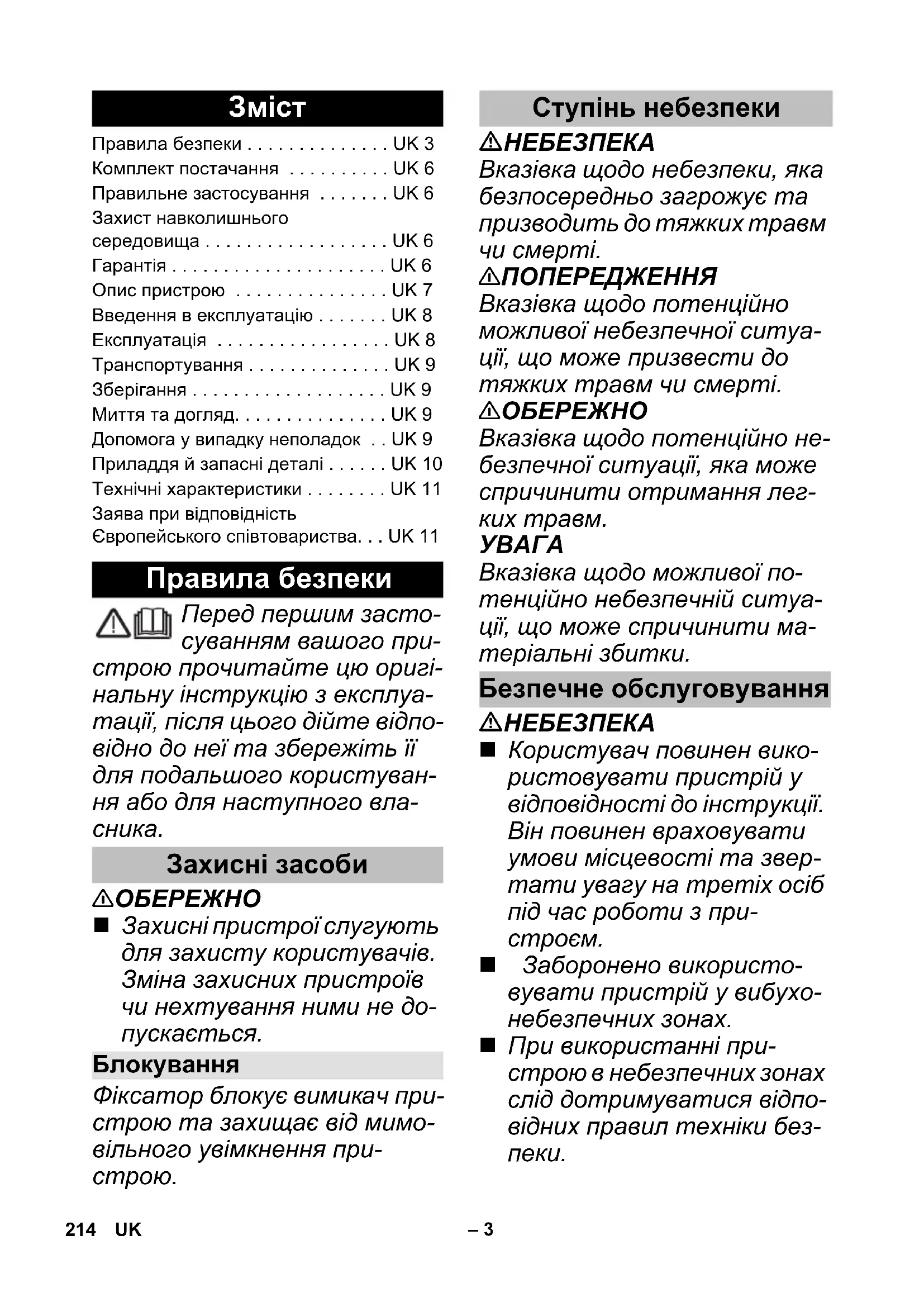 Правила безпеки . . . . . . . . . . . . . . UK 3 Комплект постачання . . . . . . . . . . UK 6 Правильне застосування . . . . . . . UK 6 Захист навколишнього середовища . . . . . . . . . . . . . . . . . . UK 6 Гарантія . . . . . . . . . . . . . . . . . . . . . UK 6 Опис пристрою . . . . . . . . . . . . . . . UK 7 Введення в експлуатацію . . . . . . . UK 8 Експлуатація . . . . . . . . . . . . . . . . . UK 8 Транспортування . . . . . . . . . . . . . . UK 9 Зберігання . . . . . . . . . . . . . . . . . . . UK 9 Миття та догляд. . . . . . . . . . . . . . . UK 9 Допомога у випадку неполадок . . UK 9 Приладдя й запасні деталі . . . . . . UK 10 Технічні характеристики . . . . . . . . UK 11 Заява при відповідність Європейського співтовариства. . . UK 11 Правила безпеки Захисні засоби