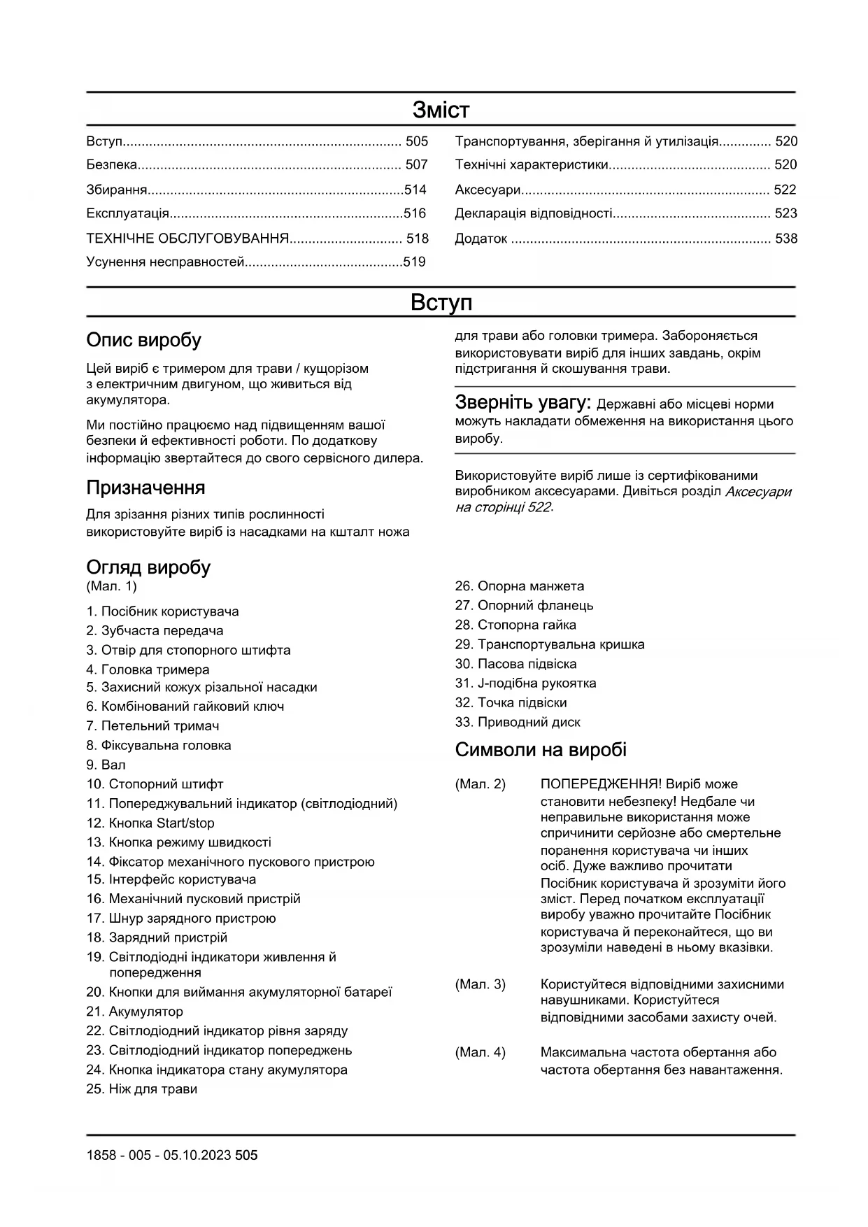 Символи на виробі (Мал. 2) ПОПЕРЕДЖЕННЯ! Виріб може становити небезпеку! Недбале чи неправильне використання може спричинити серйозне або смертельне поранення користувача чи інших осіб. Дуже важливо прочитати Посібник користувача й зрозуміти його зміст. Перед початком експлуатації виробу уважно прочитайте Посібник користувача й переконайтеся, що ви зрозуміли наведені в ньому вказівки. (Мал. 3) Користуйтеся відповідними захисними навушниками. Користуйтеся відповідними засобами захисту очей. (Мал. 4) Максимальна частота обертання або частота обертання без навантаження. 1858 - 005 - 05.10.2023 505XXXX/хв