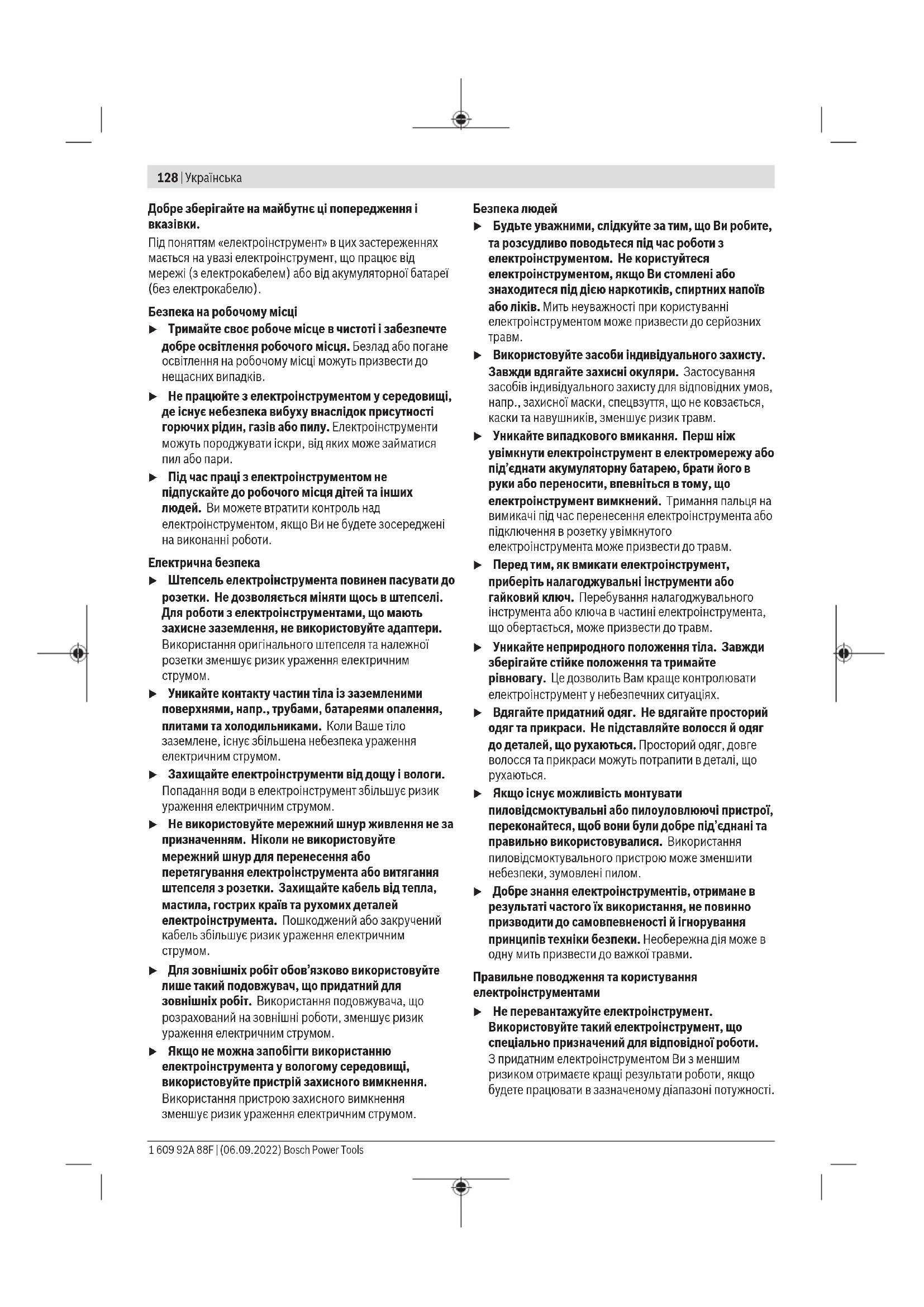 Прочитайте всі вказівки з техніки безпеки, інструкції, ілюстрації та специфікації, надані з цим електроінструментом. Невиконання усіх поданих нижче інструкцій може призвести до ураження електричним струмом, пожежі і/або серйозної травми. Bosch Power Tools 1 609 92A 88F | (06.09.2022)128 | Українська Добре зберігайте на майбутнє ці попередження і