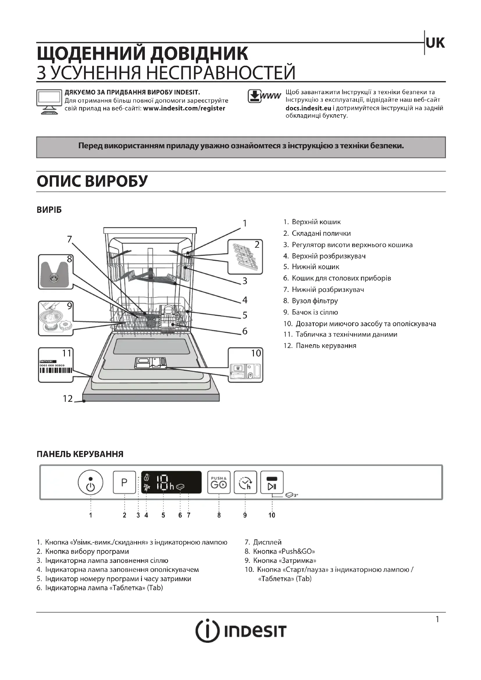 Перед використанням приладу уважно ознайомтеся з інструкцією з техніки безпеки. ДЯКУЄМО ЗА ПРИДБАННЯ ВИРОБУ INDESIT. Для отримання більш повної допомоги зареєструйте свій прилад на веб-сайті: www.indesit.com/registerЩоб завантажити Інструкції з техніки безпеки та Інструкцію з експлуатації, відвідайте наш веб-сайт docs.indesit.eu і дотримуйтеся інструкцій на задній обкладинці буклету.1. Верхній кошик2. Складані полички3. Регулятор висоти верхнього кошика4. Верхній розбризкувач5. Нижній кошик6. Кошик для столових приборів7. Нижній розбризкувач8. Вузол фільтру9. Бачок із сіллю10. Дозатори миючого засобу та ополіскувача11. Табличка з технічними даними12. Панель керування ЩОДЕННИЙ ДОВІДНИК З УСУНЕННЯ НЕСПРАВНОСТЕЙ ПАНЕЛЬ КЕРУВАННЯ ОПИС ВИРОБУ 0000 000 00000 Service: