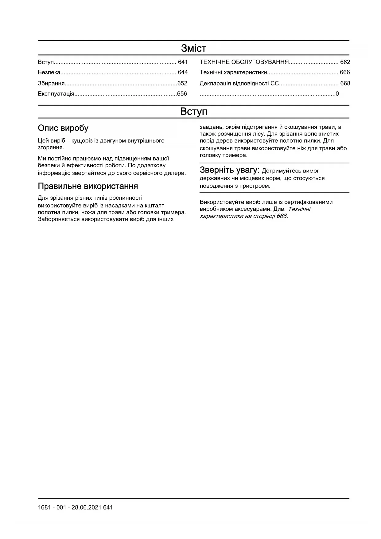Символи на виробі ОБЕРЕЖНО! Цей виріб може бути небезпечним. Необережне або неправильне використання виробу може призвести до травм або смерті оператора чи сторонніх осіб. Щоб уникнути травмування оператора чи 642 1681 - 001 - 28.06.2021сторонніх осіб, уважно прочитайте всі правила техніки безпеки, наведені в цьому посібнику користувача, і дотримуйтеся них. Перед користуванням виробом уважно прочитайте посібник користувача й переконайтеся, що ви зрозуміли всі